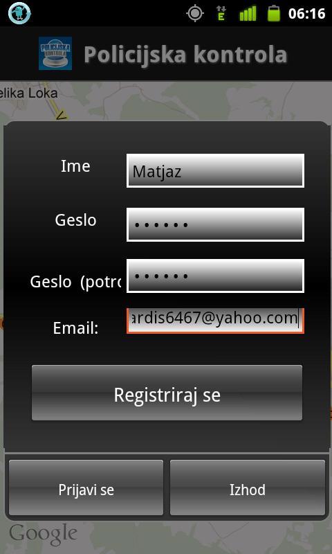 Además, tenga en cuenta que cuando se usa Policijska kontrola de la red móvil, los mapas de Google se cargan, y el teléfono también establece una conexión con el servidor, por lo que la aplicación crea algo de tráfico de datos, lo cual es bastante insignificante, especialmente porque los paquetes de suscripción de hoy generalmente contienen algunas transmisión de datos arrendados. Póngase en contacto con su operador móvil para obtener más información.