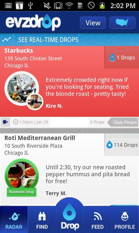 Al elaborar una caída (la versión de Evzdrop de un texto o publicación de fotos), puede hacer un chapoteo que otros que comparten sus intereses en lugares específicos pueden escuchar dentro como más allá de sus redes sociales en lugares específicos. Siguiendo los lugares de interés, puede mantenerse informado a través de pensamientos y ideas en tiempo real de otros que ya están allí.