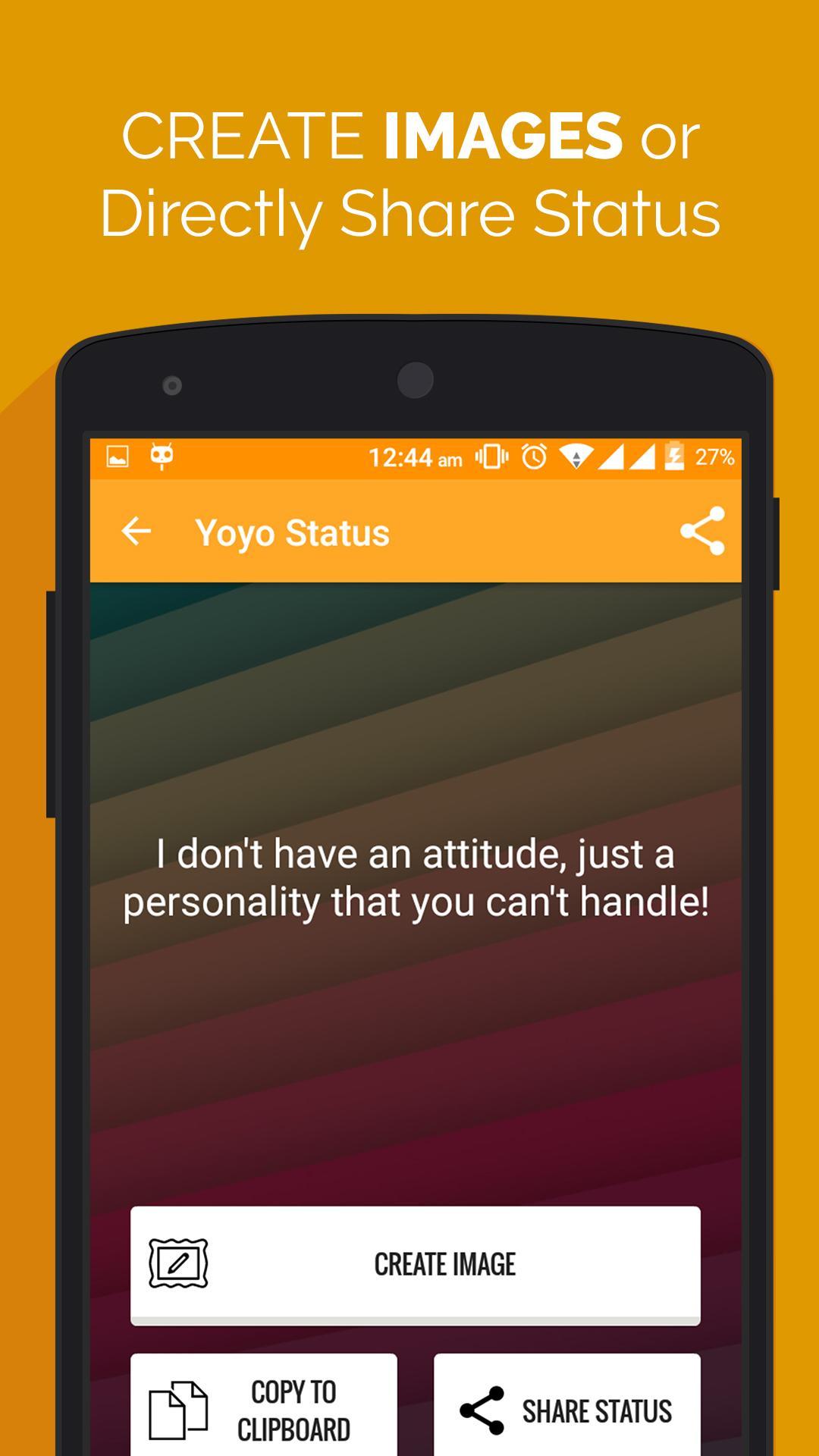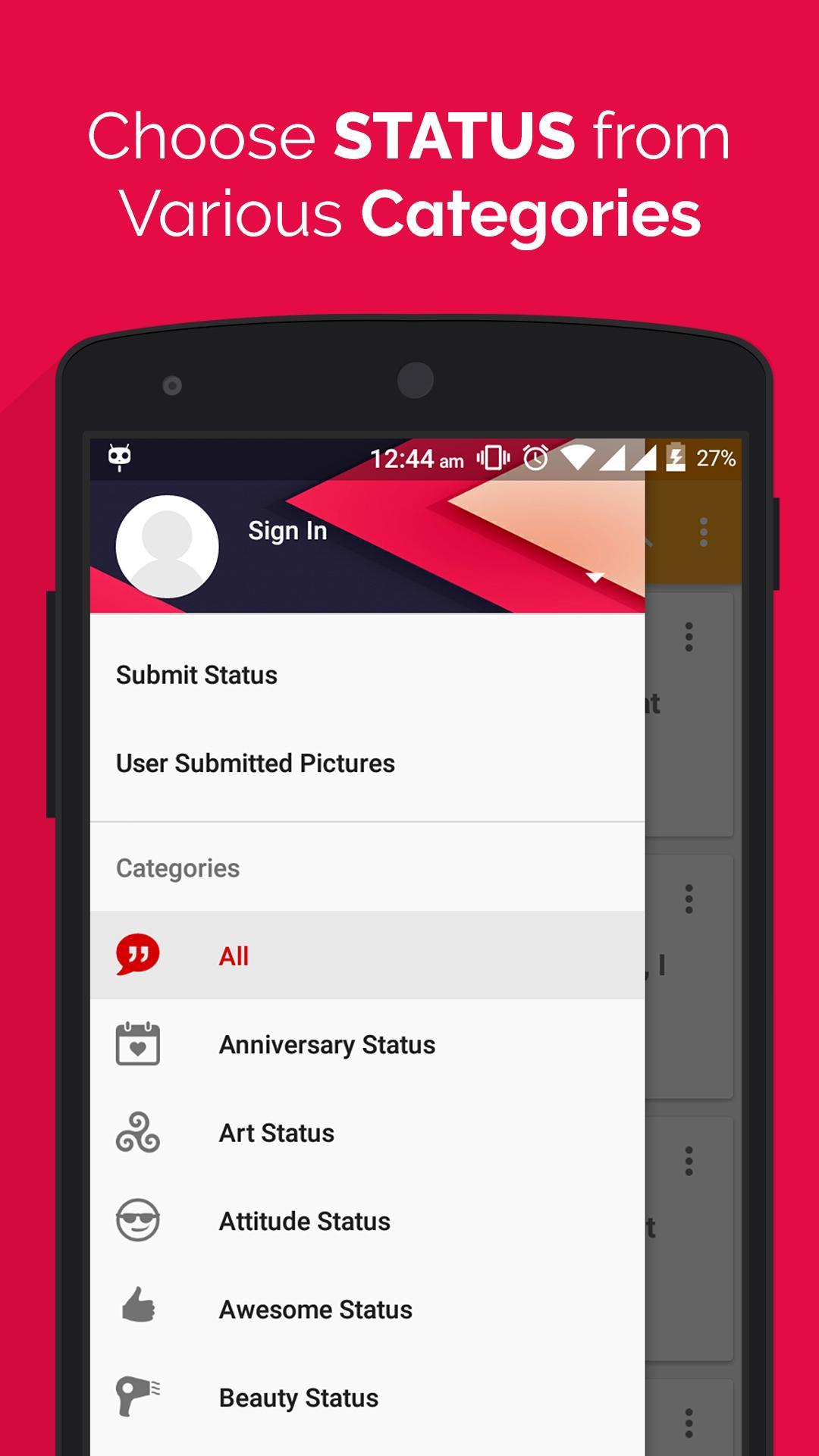 Es una aplicación que le proporciona una gran colección de mensajes de estado para compartir con sus amigos. No es necesario pensar mucho o buscar el estado que pueda coincidir con su actitud. Simplemente abra la aplicación Seleccionar la categoría, obtenga su estado y actualice tantas veces como desee con su swing de humor. Esta es una aplicación increíble para aquellos que aman chatear en aplicaciones sociales y compartir su ira, amistad, amor o dolor con sus amigos a través del DPS o el estado. También puede crear sus propias imágenes de cotización usando esta aplicación con muchos efectos de su selección.