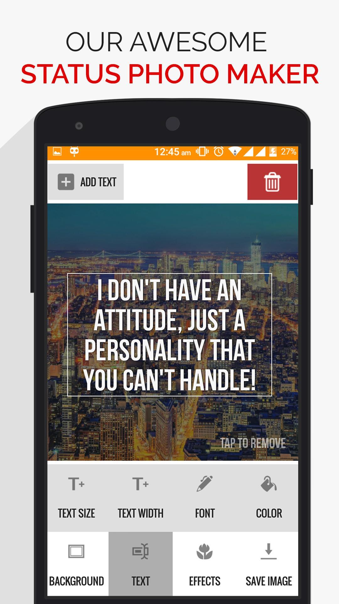 ¿Estás aburrido con tu mismo estado antiguo? ¿O no puede encontrar palabras para expresar sus pensamientos? Actualice inmediatamente cuando sienta. Revine su estado de ánimo y actitud con su estado y haga su propio DPS con la ayuda de Cotizaciones Photo Creator