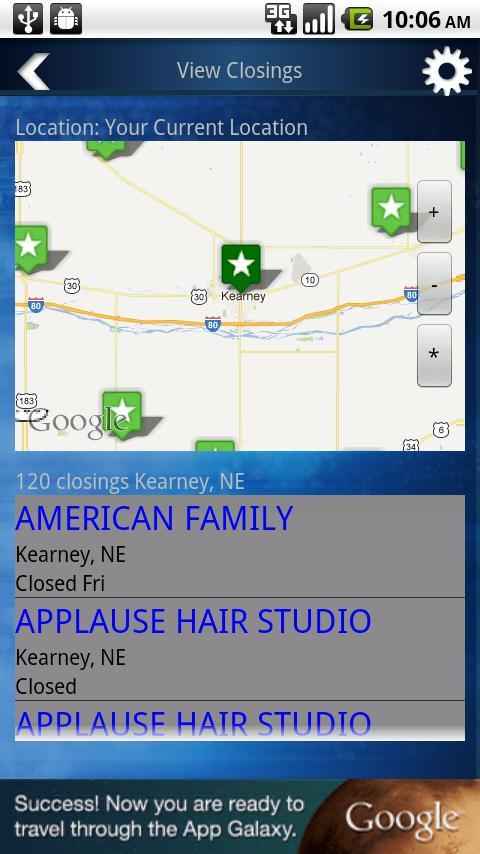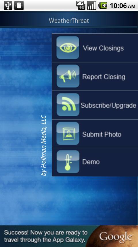 Les fermetures et autres alertes sont commodément regroupées par ville sur une carte Google et détaillées sous la carte en tant que liste de texte. La version mise à niveau de cette application permet à un utilisateur de s'abonner à des organisations spécifiques pour recevoir des notifications push peu de temps après que cette organisation émet une clôture ou une autre alerte pertinente. L'application WeatherThreat permet également aux utilisateurs de soumettre des fermetures et de s'inscrire à un compte "confirmé", directement à partir de l'application.