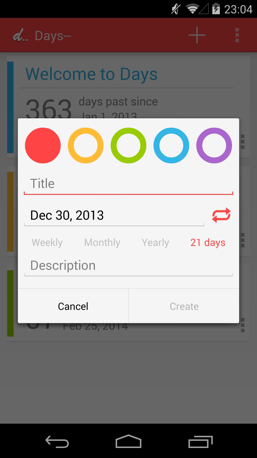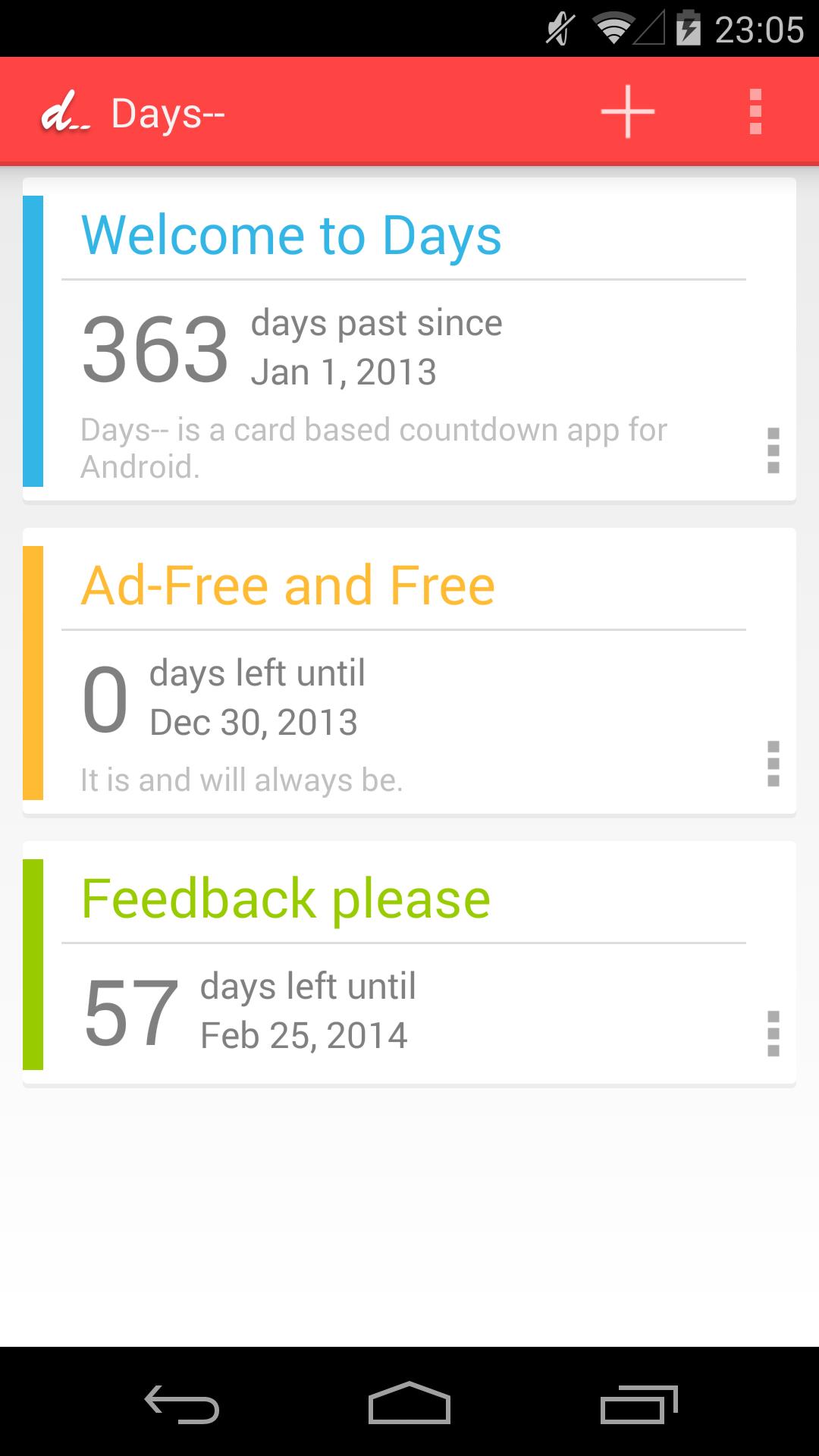 Days-- fournit toutes les fonctionnalités essentielles nécessaires pour vous rappeler vos dates importantes et vous donne des choix sur les couleurs si vous voulez garder les choses organisées. Étant donné que cette application est construite sur la base des bibliothèques open source, elle est certainement gratuite sans publicité.