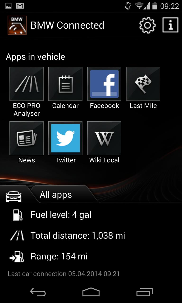 Avec BMW connecté, les conducteurs BMW peuvent accéder en toute sécurité et facilement à accéder aux fonctions générales et liées aux véhicules pendant, avant et après un voyage avec leur BMW. Cela nécessite un véhicule BMW avec une date de production de juillet 2013 ou plus tard, équipé de la fonctionnalité spéciale «applications» ou «services ConnectedDrive» (varie selon le modèle et le marché). Les modèles suivants, qui ont également été produits après juillet 2013, sont exclus: convertible en série 1 série, 1 série Coupé, 3 séries convertibles (modèle de 2010), X1 (modèle de 2009), X5 (modèle de 2006), X6 (modèle de 2008) et Z4 (modèle de 2009).