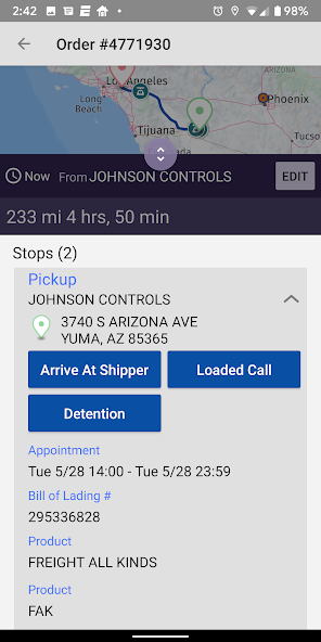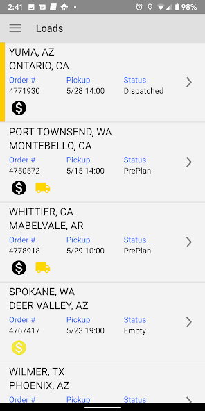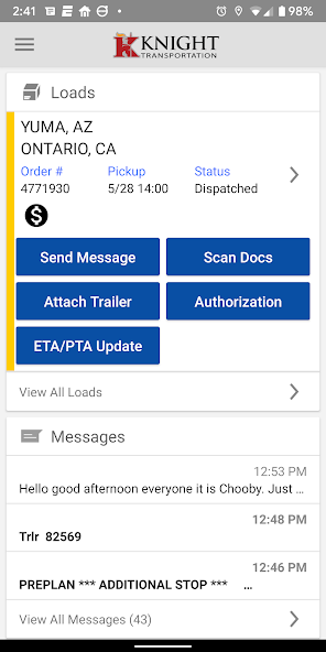L'application mobile Knight Transportation a été conçue en pensant à nos associés de conduite. Vous pouvez facilement garder une trace de vos charges actuelles et passées lors de vos déplacements.