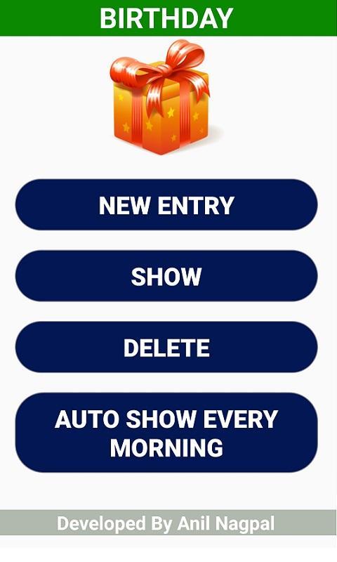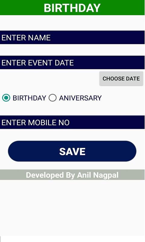 L'application de rappel d'anniversaire est pour ceux qui ne veulent pas manquer l'anniversaire ou l'anniversaire de leurs proches et amis. Dans cette application, vous devez stocker les détails de toutes les personnes dont vous ne voulez pas manquer l'anniversaire ou l'anniversaire. Vous pouvez voir aujourd'hui, demain, mensuel ou tous les détails plus tard. Vous pouvez passer des appels, ou envoyer des messages ou envoyer ce que vous souhaitez, à la personne que vous souhaitez. Chaque jour, l'application du matin vous montre des détails de ceux dont l'anniversaire ou l'anniversaire se produit ce jour-là.