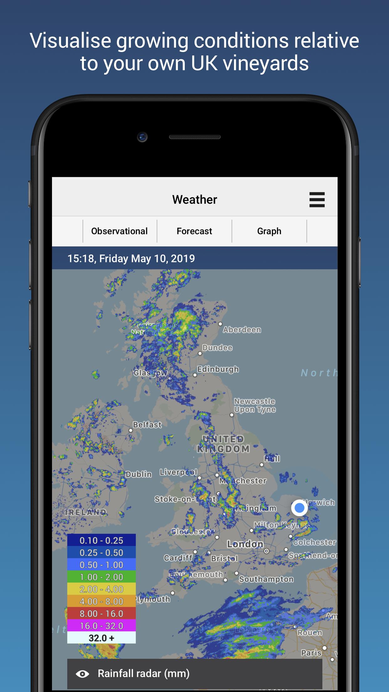 + Prévisions: recevez des services de prévision météorologiques spécifiques à la viticulture pour les vignobles britanniques qui comprendront: les conditions météorologiques actuelles, les prévisions météorologiques de 5 à 10 jours, les alertes météorologiques extrêmes et les avertissements par pulvérisation et récolte.