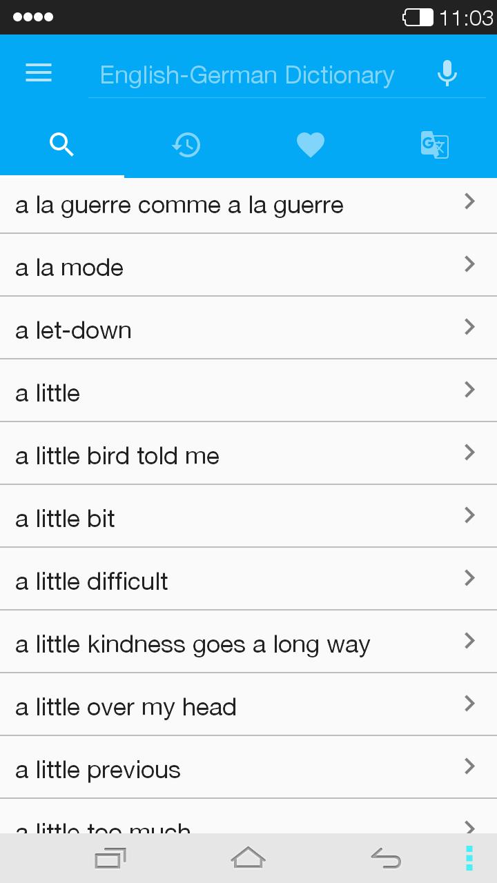 English <-> allemand DictDroid est "Dictionary Offline" (ne nécessite pas de connexion Internet) avec les fonctionnalités: