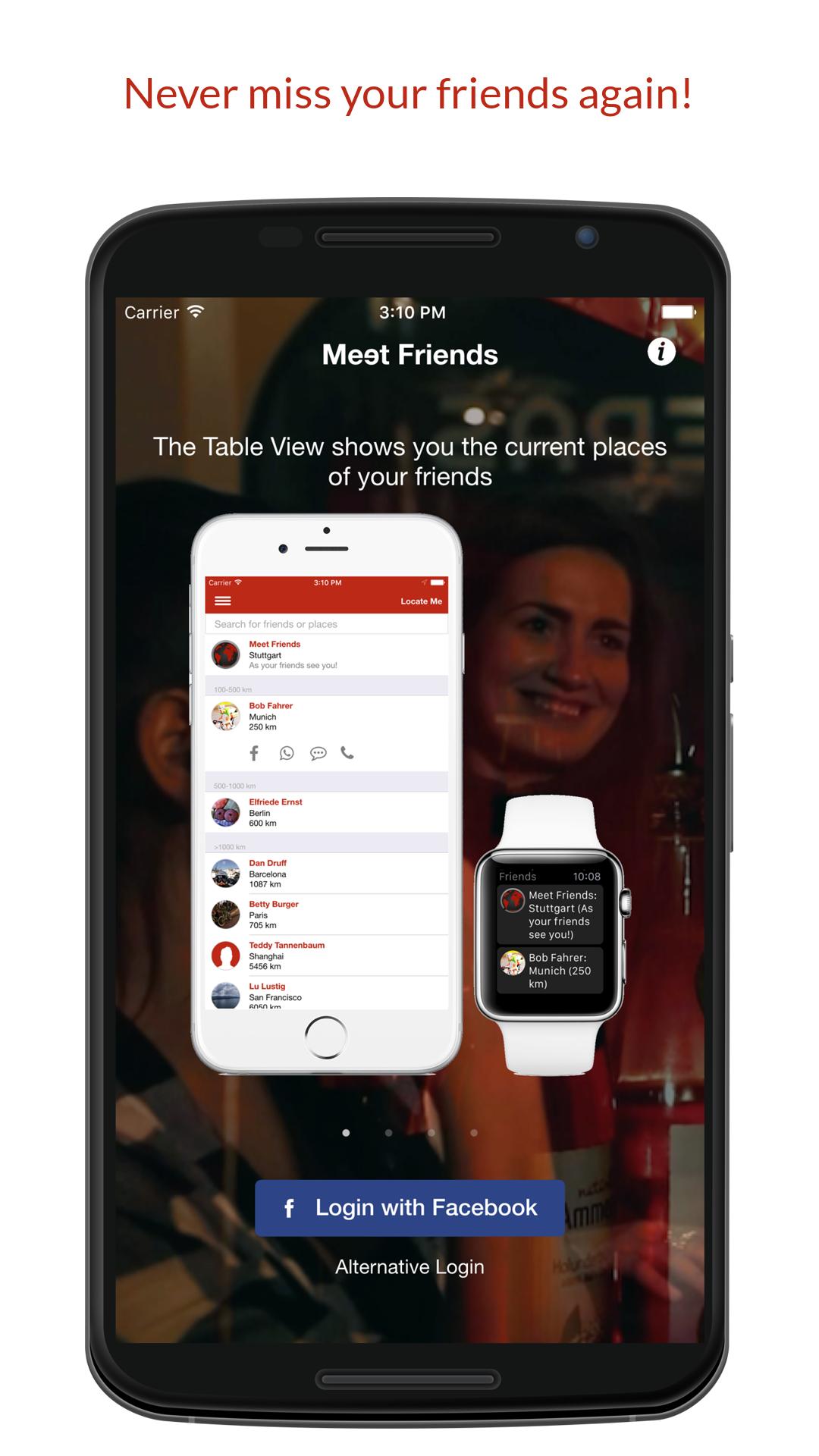 Vous avez déjà réalisé après un voyage en ville, qu'un ami était dans la même ville en même temps mais vous ne le saviez pas? Essayez Meet Friends et cela ne se reproduira plus jamais! Meet Friends vous montre la ville actuelle de vos amis et vous envoie une notification de poussée, si un ami est autour de vous. Mais nous n'utilisons jamais votre emplacement exact.