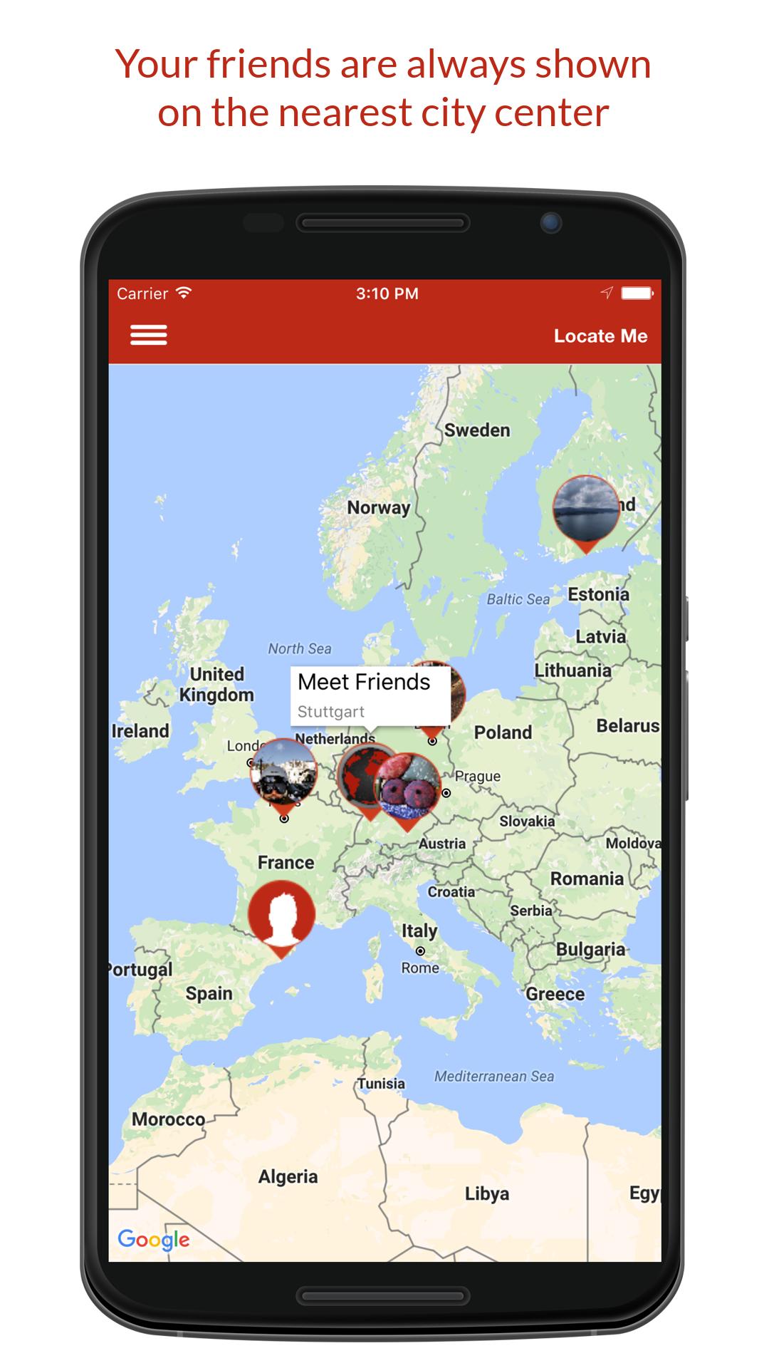 * Confidentialité: nous n'utilisons que le centre-ville le plus proche de l'emplacement, où vous êtes actuellement. Nous n'utilisons jamais votre emplacement exact. Si vous êtes à Berlin près du Brandenburger Tor, nos serveurs et vos amis sauront seulement que vous êtes à Berlin, mais pas exactement.