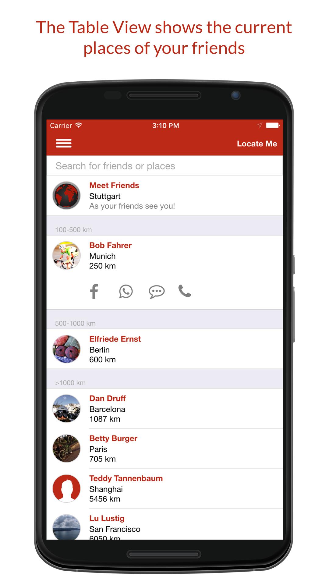 * Trouvez des amis: vous avez deux possibilités de voir activement où sont vos amis. Soit dans une table en tant que liste, soit sur une carte avec une broche pour chaque ami.