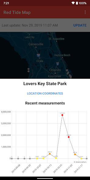 Cette application montre une carte avec des mesures récentes de la marée rouge (floraison des algues nocives) pour les zones côtières de Floride.