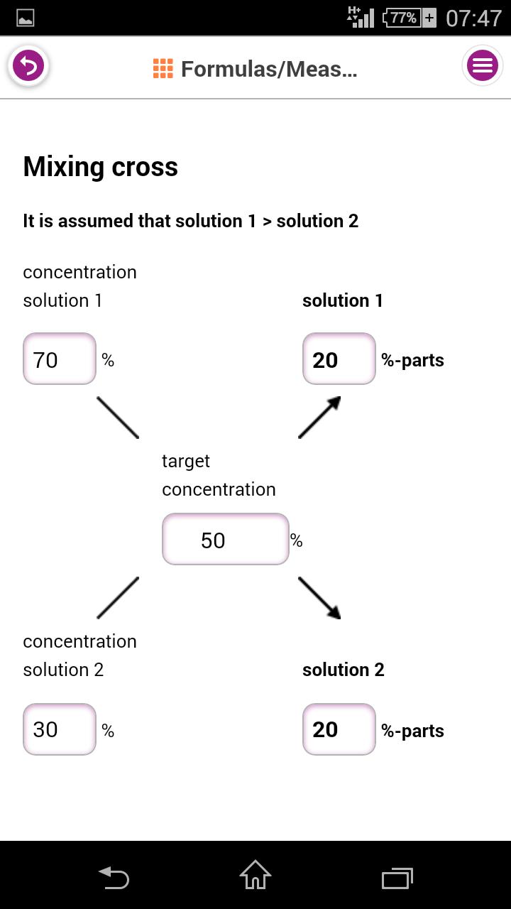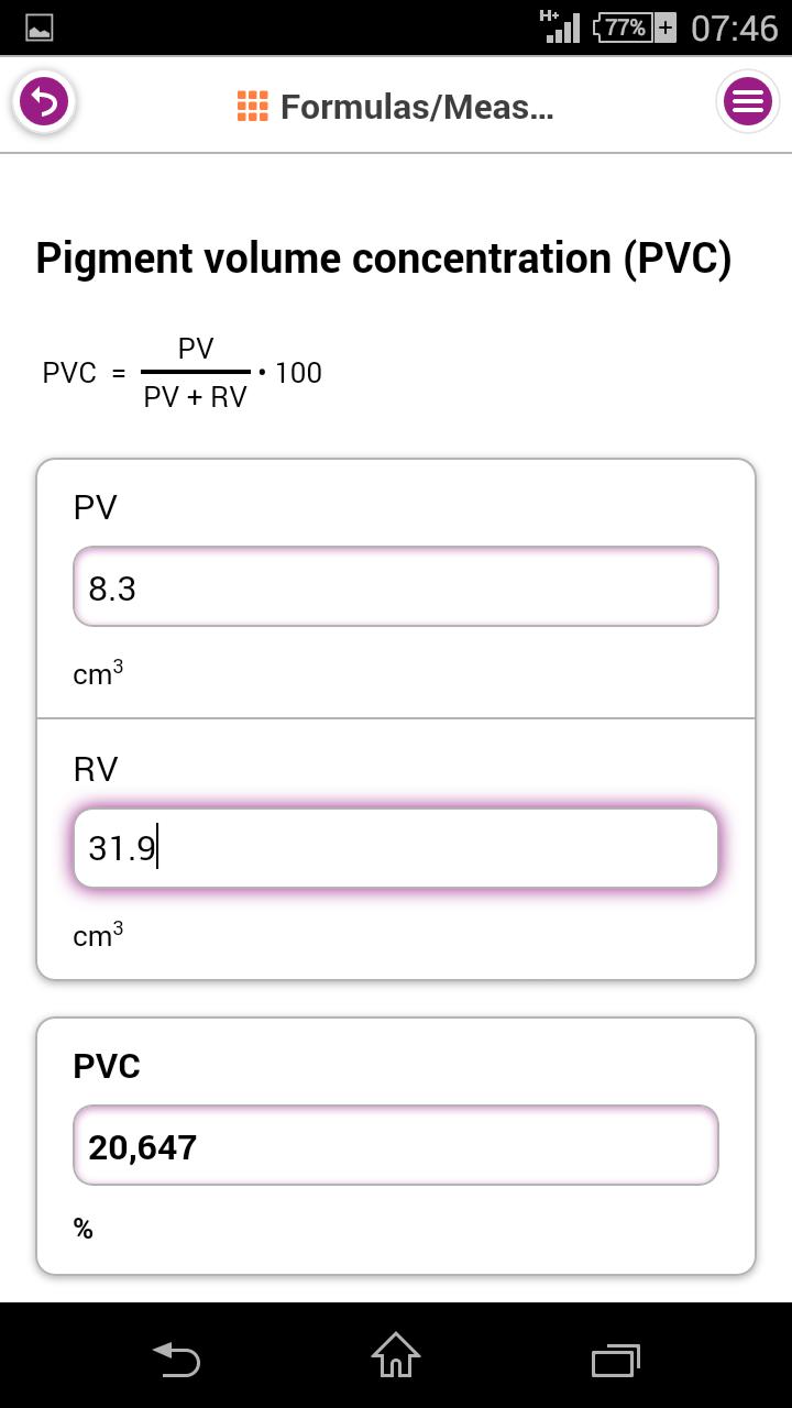 Les paramètres importants peuvent être facilement calculés avec la collection de formules contenues dans cette application. Alors que la concentration de volume de pigment appropriée, une valeur croisée de mélange ou des conversions de vitesse de rotation de rotation, entrant vos valeurs dans l'application donnera rapidement le résultat correct.