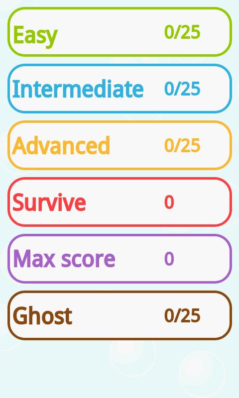 Il existe une liste des meilleurs scores pour chaque mode de jeu. Dans les modes Facile, Intermédiaire, Avancé et Fantôme, vous obtenez le score total à télécharger dans le classement lorsque vous terminez tous les niveaux de jeu. Le score total est la somme de chaque score de niveau. Dans les modes Survive et Max Score, les scores peuvent être téléchargés à partir du premier résultat. Vous pouvez rejouer n'importe quel niveau pour obtenir un meilleur score et améliorer le score total.