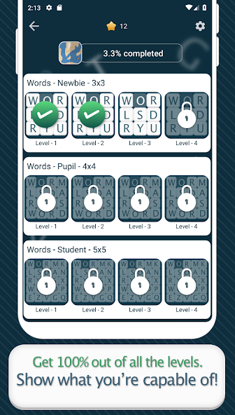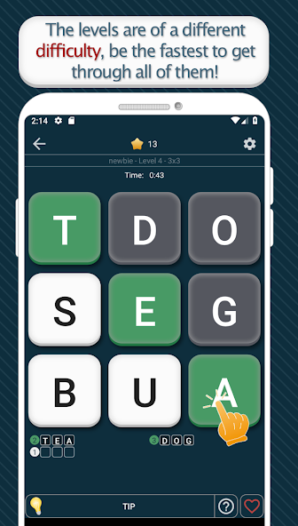 Our search word game will help to develop your skills. Go all the way from" Student "to" Scientist", your brain training depends on Your attention in our word finder puzzle. If you can create words from letters or find word fast - our word search game is completely for you. So, your speed and resourcefulness is the best way to have success in word find games.