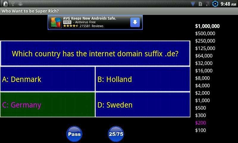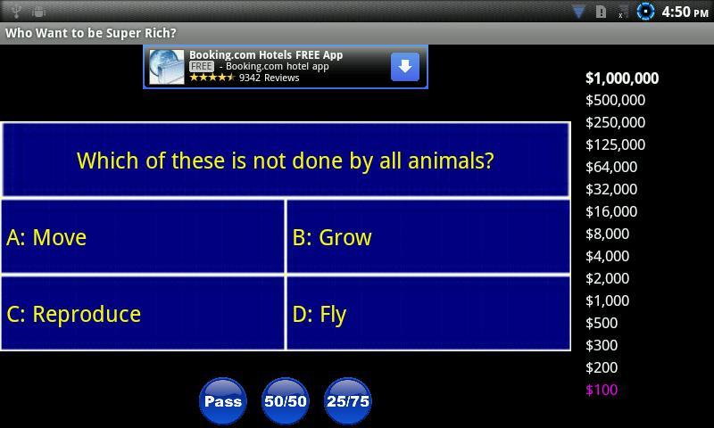 Who Wants to be Super Rich contains thousands of trivia questions. Subjects covered range from science, sports, politics, geography, history, music, movies, math, foreign languages, religion, video games, computers and everything in between. Use your lifelines to get help if you are unsure of an answer.