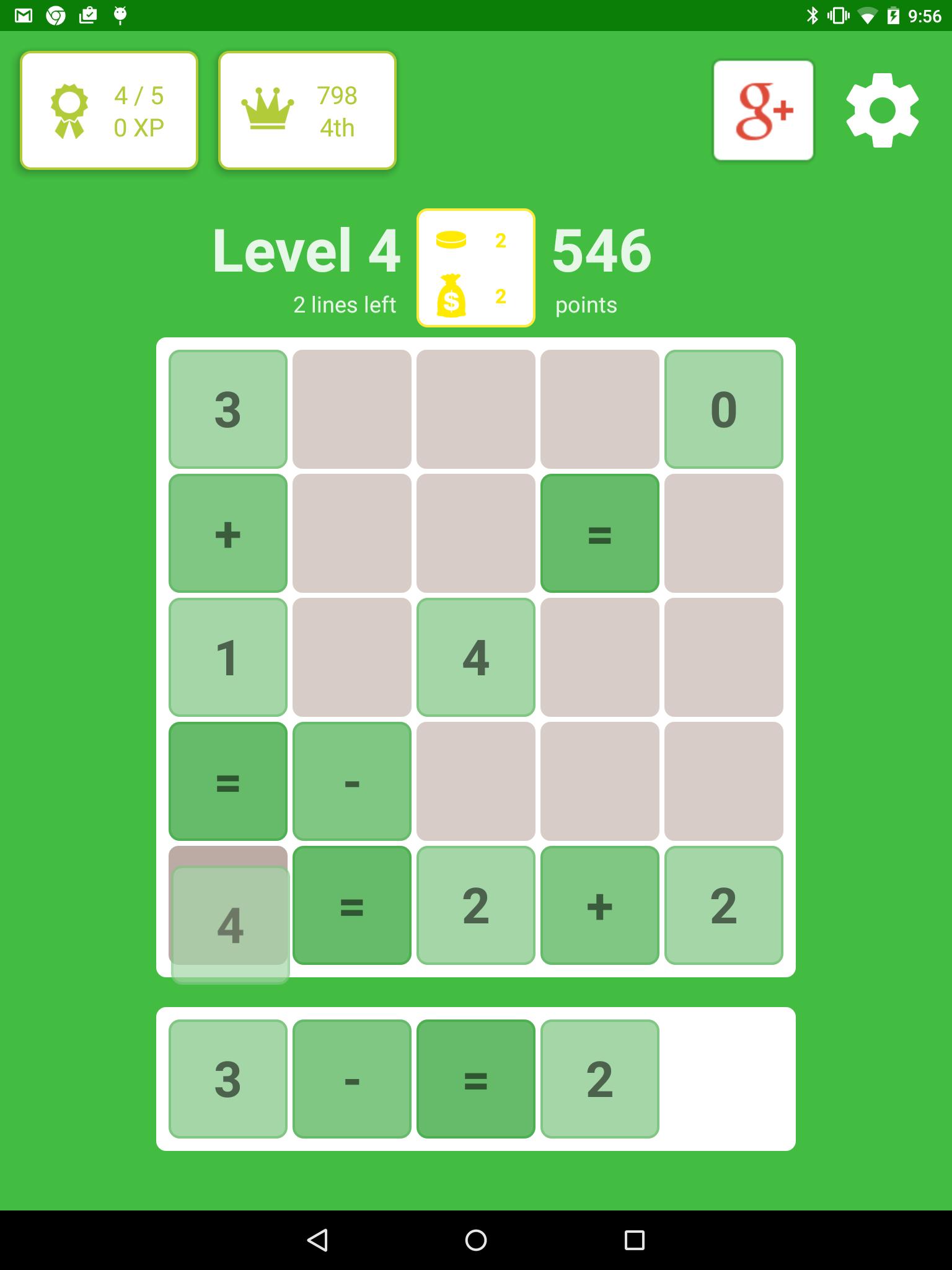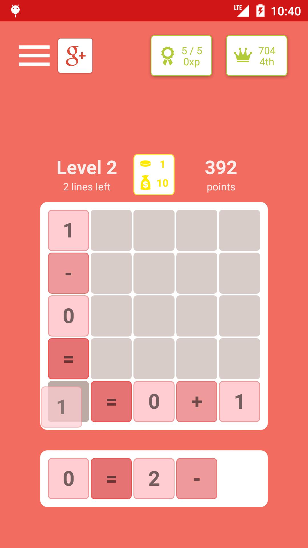 The goal is to finish all 10 levels, writing the correct operations in the grid with numbers and operators available. Any complete operation disappears from the grid to make room for the following.