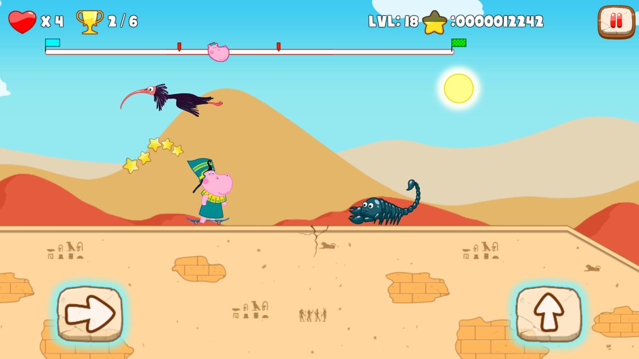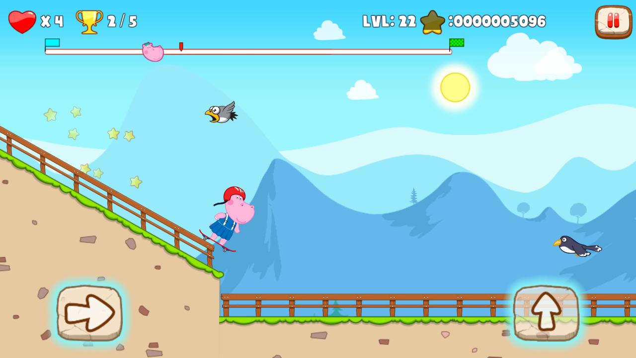 The game has checkpoints from which you can continue the game if you lose. The result it is a colorful runner for kids with Hippo in the starring.