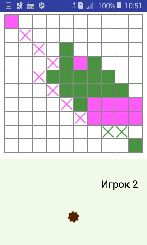 Players take turns playing. Each has five moves. Player number 1 starts (upper left corner). If the enemy cell is eaten, then a fortress is formed in its place, which can no longer be eaten. You can walk from any place in the fortress only if at least one of your cells is next to it. The goal of the game is to eat all the opponent's cells or lock them in your fortress and protect your own. If during your round, it turns out that there is no room for a move, then a defeat is counted. The initial bases are active (you can walk from them), therefore, in order to win, they must also be locked.