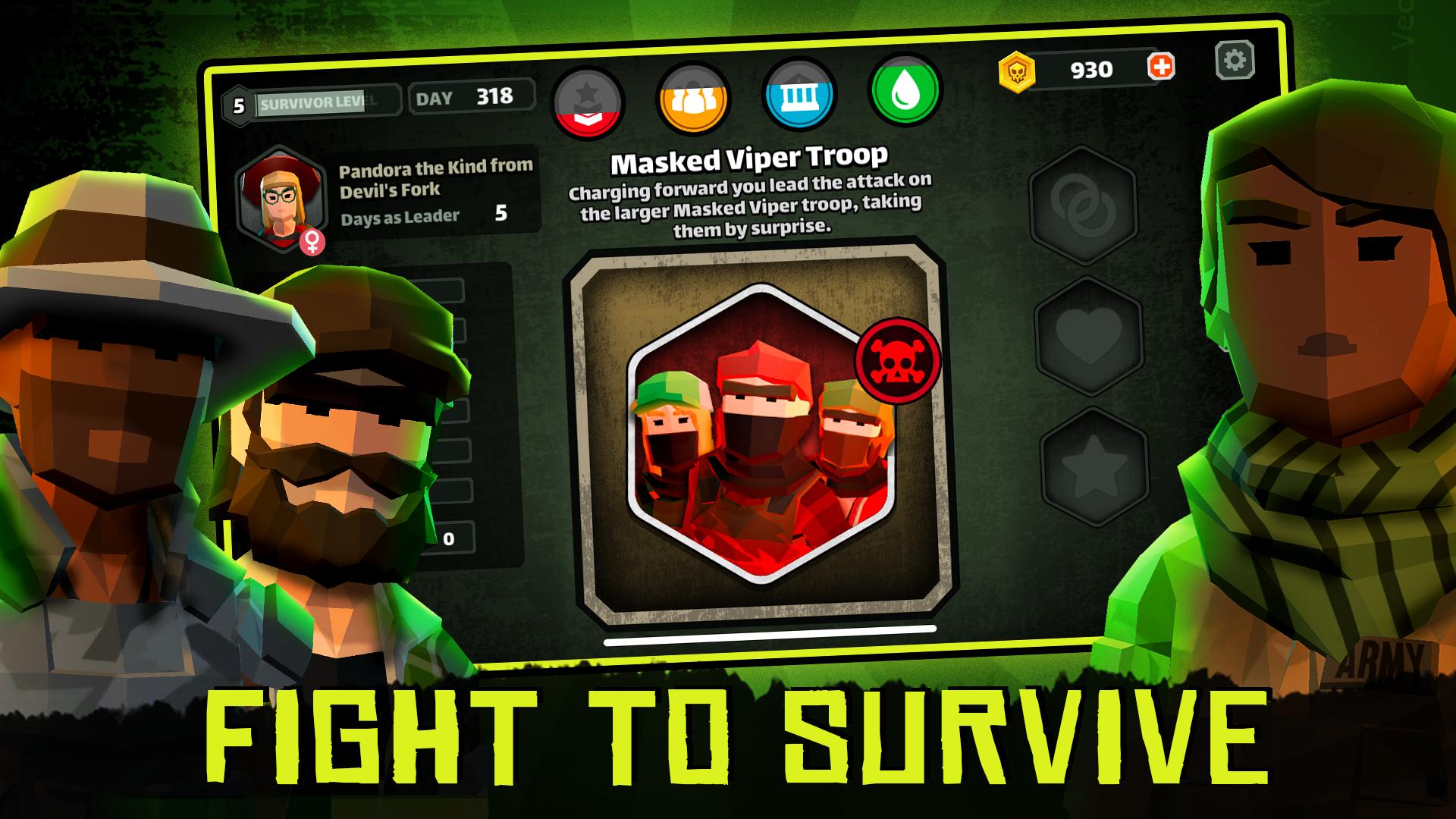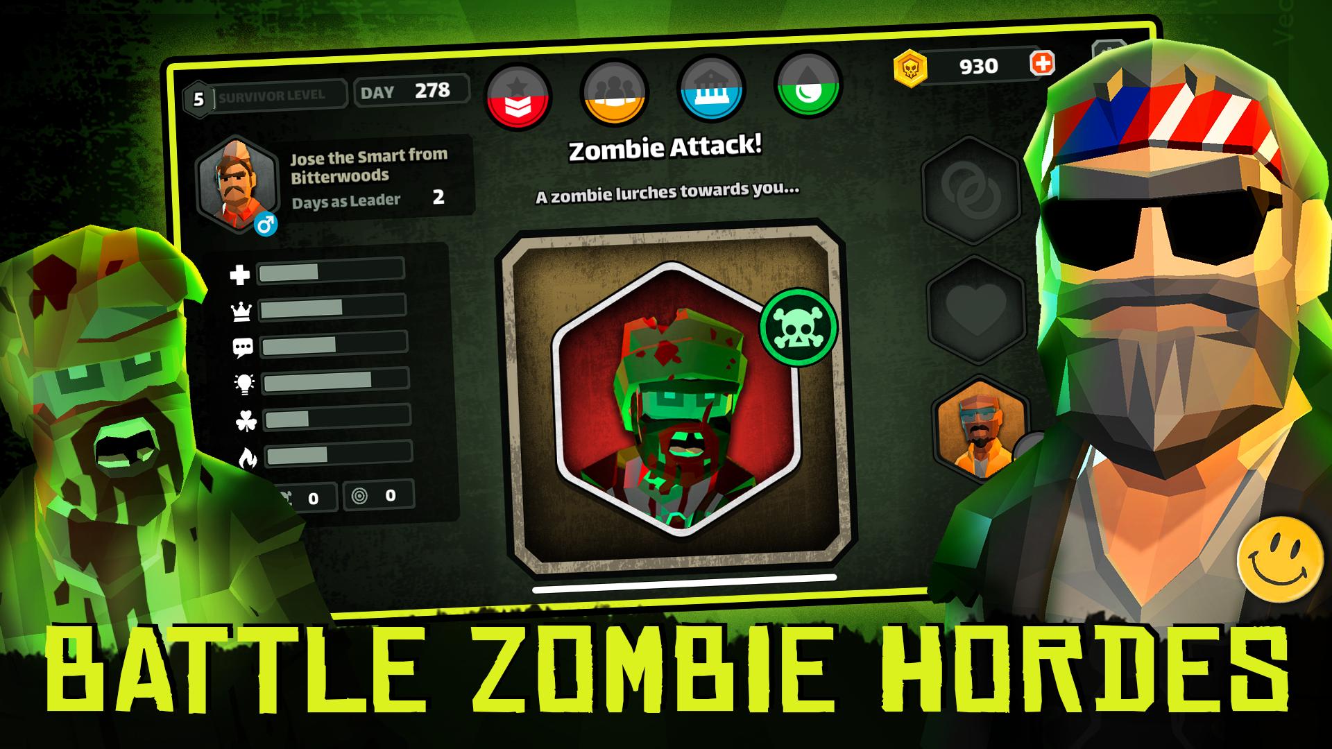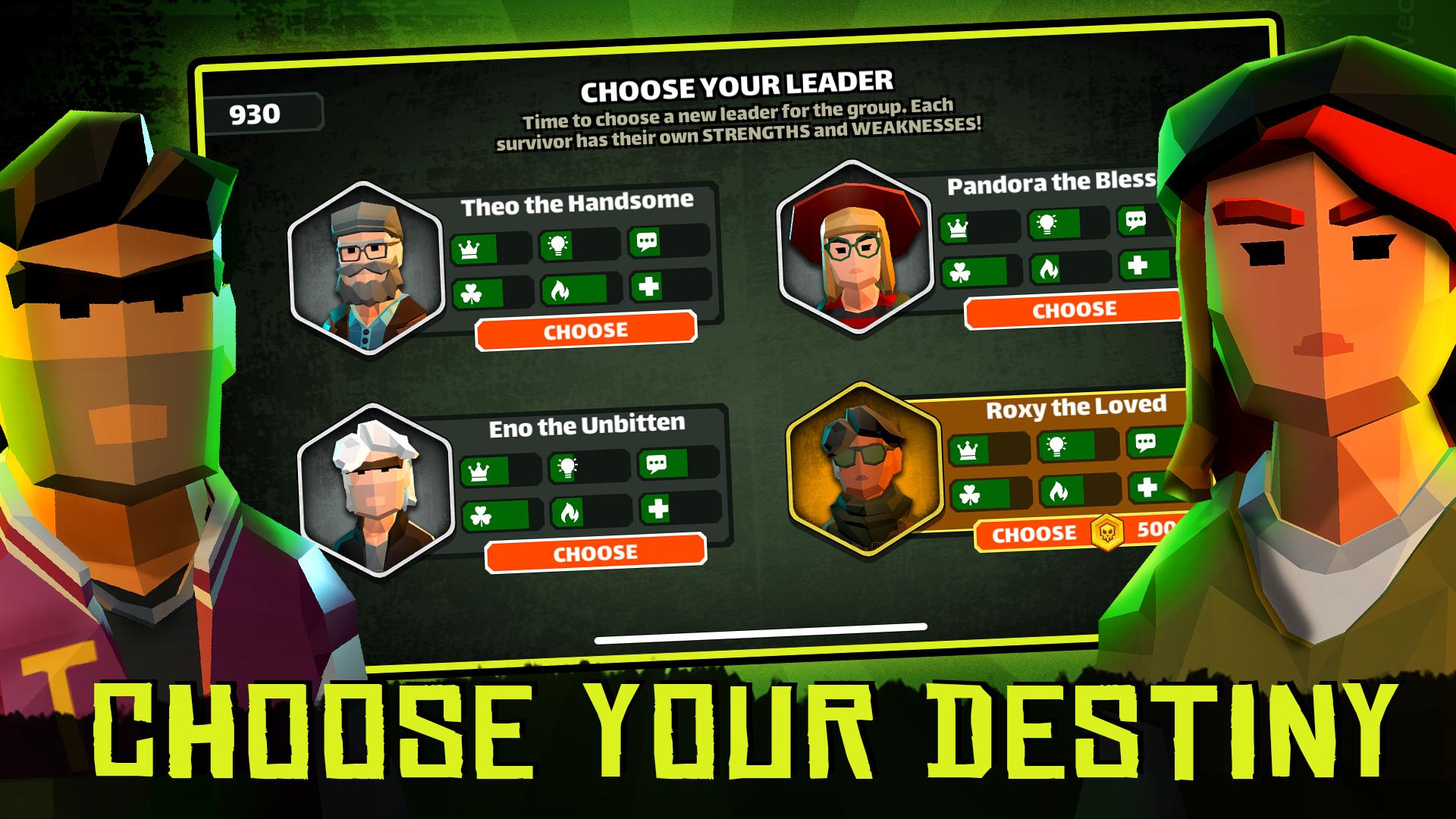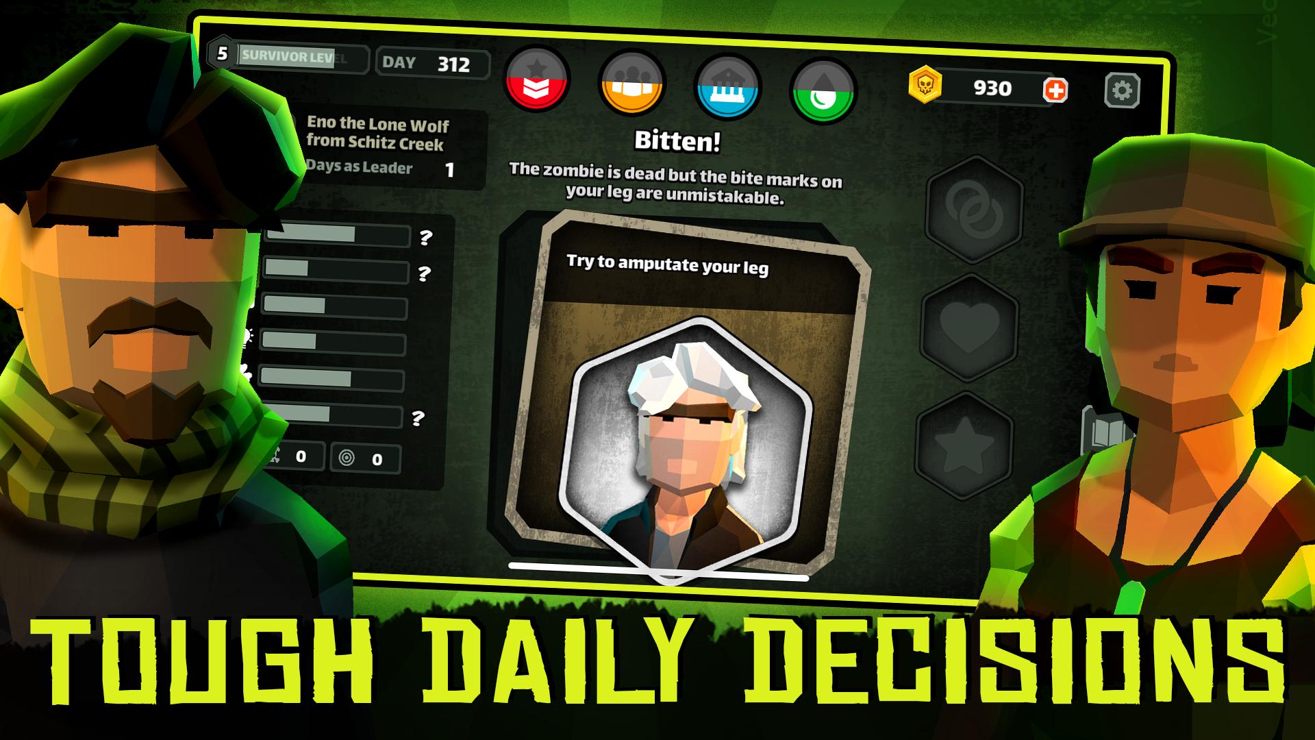 Swipe left or right each day to make important decisions for your group as you strive for balance between soldiers, followers, elders, and your limited resources. Each choice can be the difference between your group surviving the apocalypse or becoming part of the zombie horde.