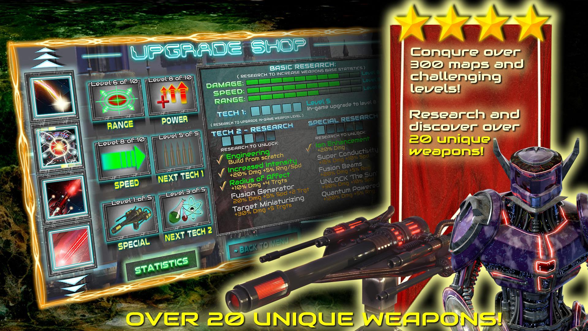 Strengthen your defense by researching over 20 unique defensive weapons and enhance them to new heights with an immense tech tree. Unlock defensive walls to help your td strategy.