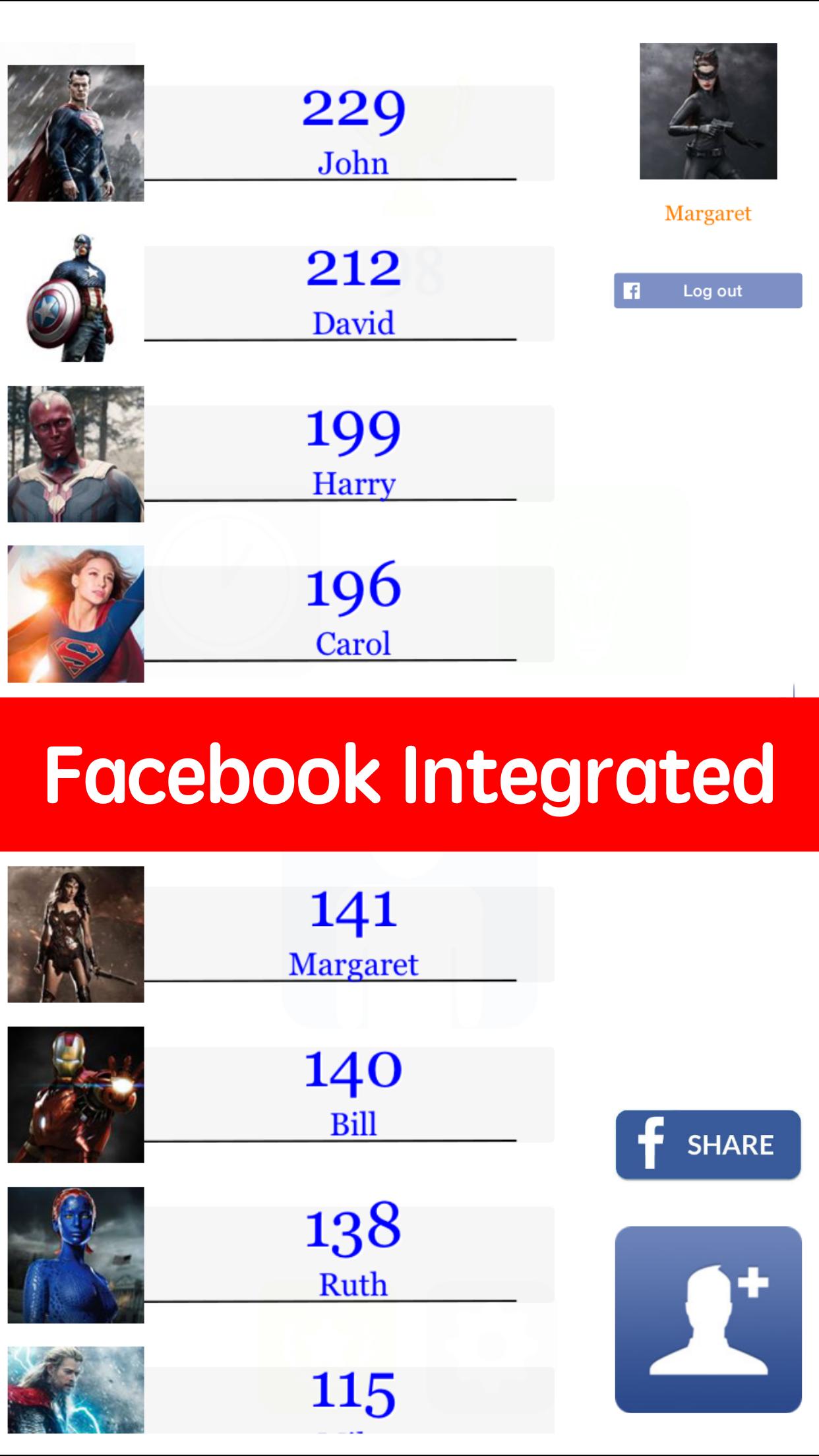 - Integrates Facebook functionalities, such as Share to friends, Invite Friends, Challenge Friends and also posts the scores to Facebook.