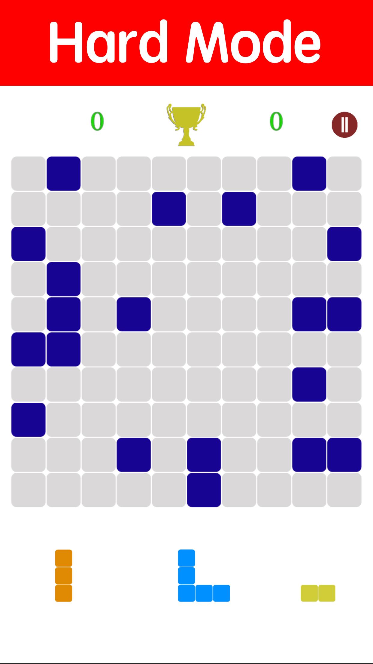 - In Hard mode, initially 20 blocks randomly placed. If the blocks are less than or equal to 10 blocks, 10 more blocks randomly placed and also get extra 100 scores.