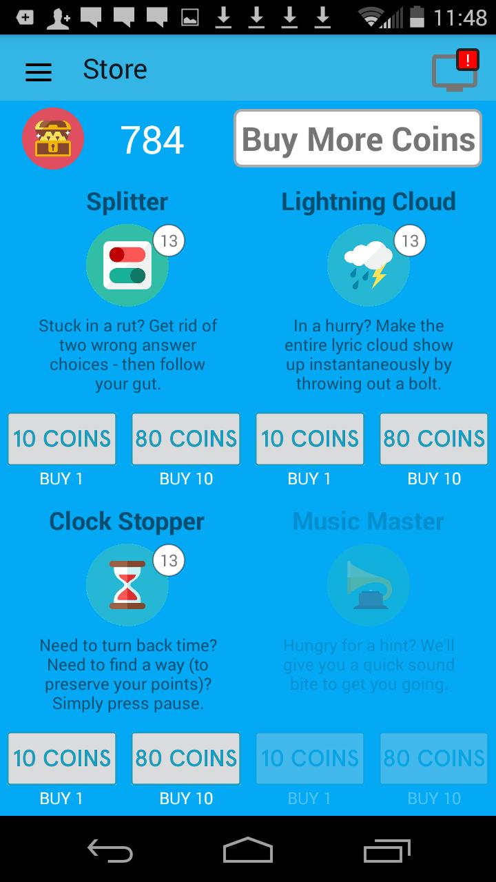 Purchase power-ups to freeze the lyric cloud, have the cloud appear immediately or get rid of 2 answer choices. Need a few notes of the music, we got that power-up coming soon
