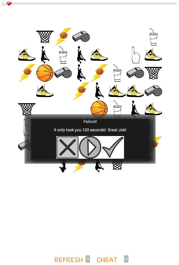 Basketball Made Simple is a matching game for the Basketball Fanatic. It features cards with a clean sports theme. The gameplay is simple: Match the game cards, but make sure they have a linear link! If they don't, each sweet little streetball icon will foul you with their hearts while your time runs out! Don't worry if you get stuck, you can always push the refresh button (and by always I mean 3 times) if you need the game to make a match for you, you can use the cheat button (3 times as well). Each round becomes more difficult, so