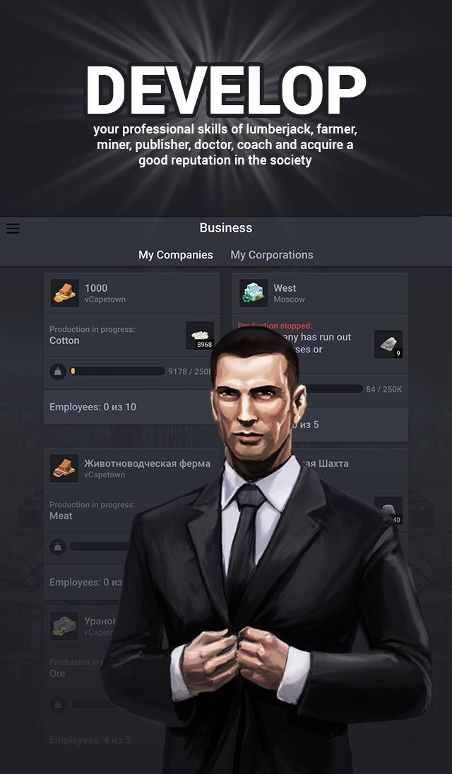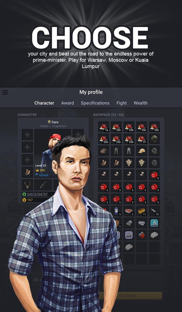 Become a citizen of one of the largest megacities of any country you like, and embark on the path of power struggle, leading your people to riches, prosperity, and glory. It is for you to decide how to take over the government: you can win a clean election, or put your contenders out of the way by dint of Byzantine politics, you can come into power by organizing a classic color revolution or by launching an ingenious multi-move combination, which could bring to shame even the notorious Niccolò Machiavelli.