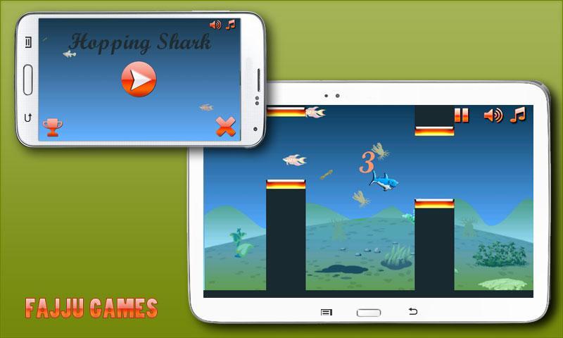 The shark has come out to have fun beneath the ocean. She is sailing underwater and hopping. She has changed her sailing style. Shark will not sail straight but by hopping. So you need to help her to in hopping properly. The shark is hungry and need to reach her den. There is a secret path, where no one will be there to attack her. But this secret path is full of dangerous pillars. Who have current flowing in them. If the jaw or any part of the shark is touched with it, she will die instantly. Shark can avoid this by hopping properly. Tap on the screen to make her hopping proper and accurate. When you tap on the screen the shark will rise, but came back down fast again, because of gravity, so tap again to rise her up again. And take care of the dangerous obstacles. The pillars have high intensity electricity. If shark touches it accidently she will die. Help her to escape safely from these dangerous pillars.