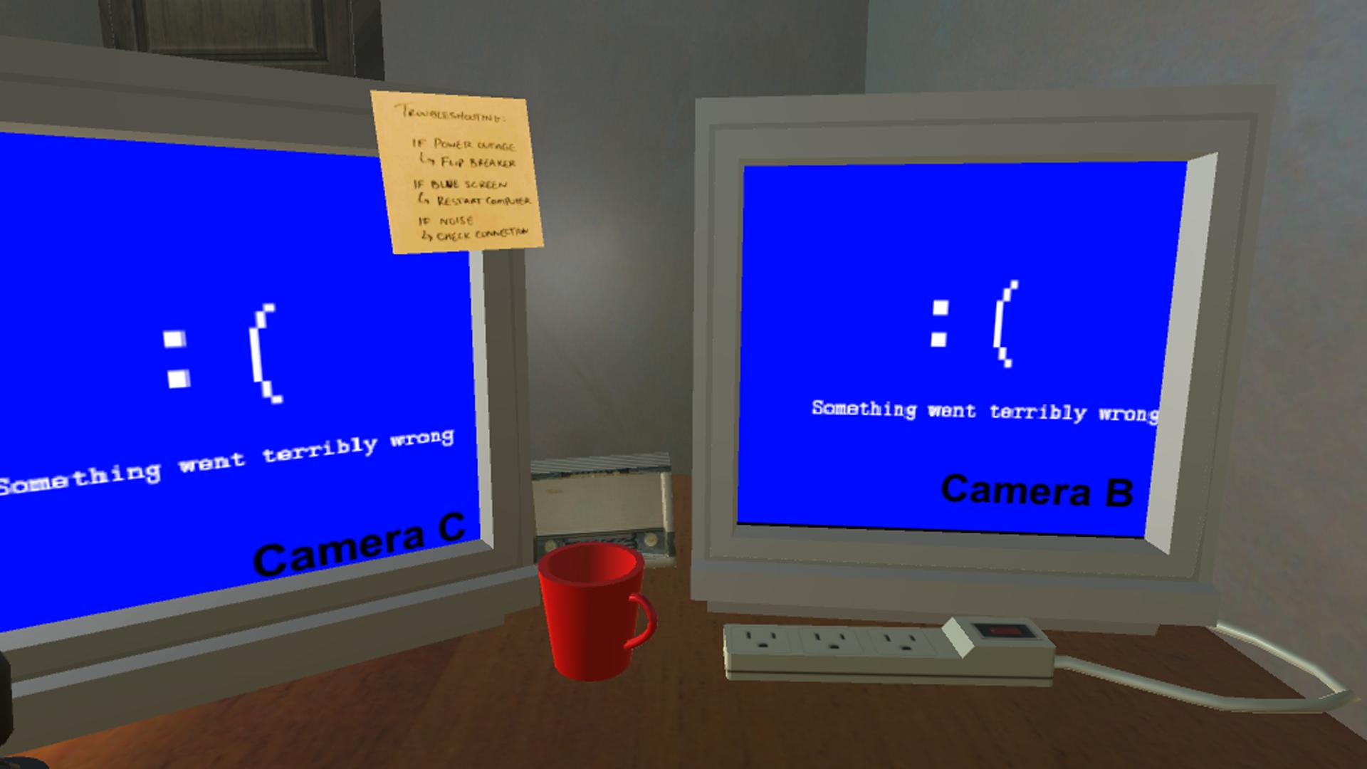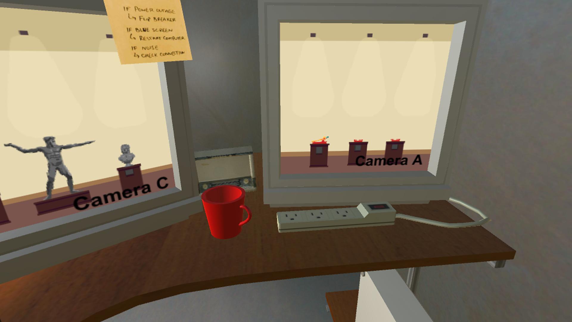 You are a security guard at a museum and are tasked with keeping the museum safe, but it’s a rough night and your equipment is constantly failing you. A thief is taking advantage of the situation and is stealing artifacts from the museum. You must sound the alarm if you catch him stealing anything. If you successfully catches the thief, you win, but if you triggers a false alarm or too many things go missing, you’re fired!