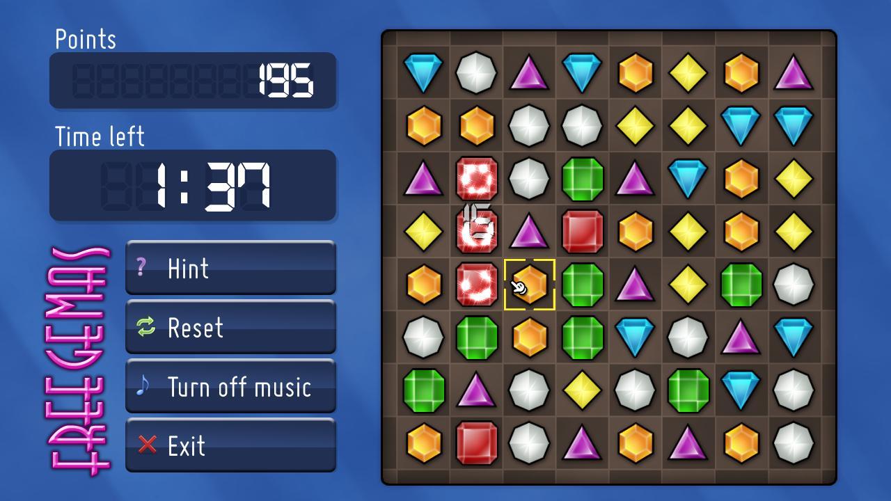 Freegemas is a free puzzle game where the player has to align groups of three or more adjacent gems by swapping two of them at a time.