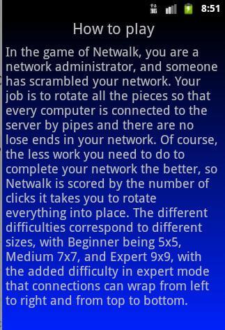 In the game of Netwalk, you are a network administrator, and someone has scrambled your network. Your job is to rotate all the pieces so that every computer is connected to the server by pipes and there are no lose ends in your network.