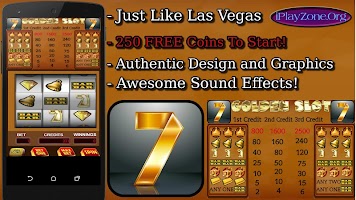 Welcome to Golden Slot; a classic 3-reel Las Vegas Style slot machine app. The thrills start with 250 FREE gold slot coins! The authenticity of this hit the gold slot app provides a realistic casino slot experience at your fingertips when downloaded to your mobile device! You can decide what level of risk suits you best!