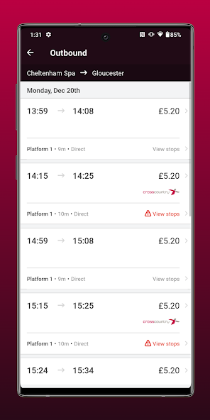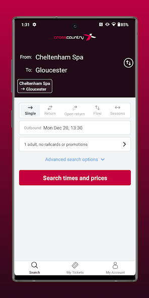 Pesan tiket kereta Anda dengan cepat dan mudah dengan aplikasi CrossCountry . Anda dapat mencari waktu kereta api langsung, memeriksa informasi berjalan waktu nyata dan membeli tiket kereta Anda untuk setiap kereta di National Rail Network. Ini gratis untuk diunduh, dan kami tidak akan membebankan biaya pemesanan atau biaya kartu kredit kepada Anda.
