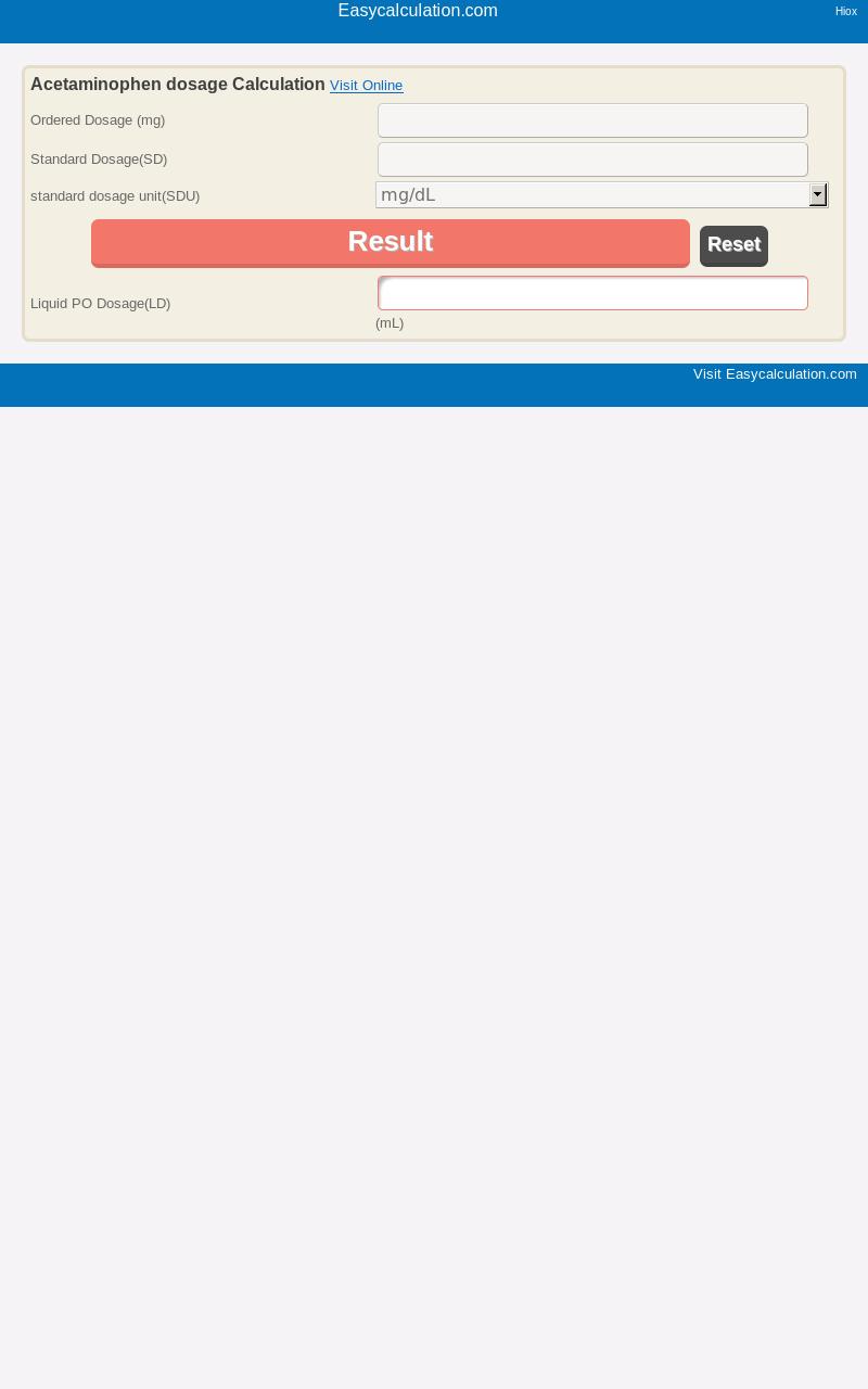Kalkulator dosis parasetomol acetaminophen menggunakan rumus dosis po cair (LD).