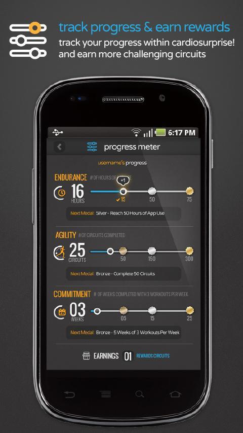 Cardiosurprise menampilkan meteran kemajuan yang melacak sejarah latihan dan pencapaian Anda secara keseluruhan. Saat Anda maju melalui Meter Kemajuan, Anda akan memiliki kesempatan untuk mendapatkan hingga 9 sirkuit lagi tanpa biaya tambahan. Tidak diperlukan peralatan untuk melakukan sirkuit ini.