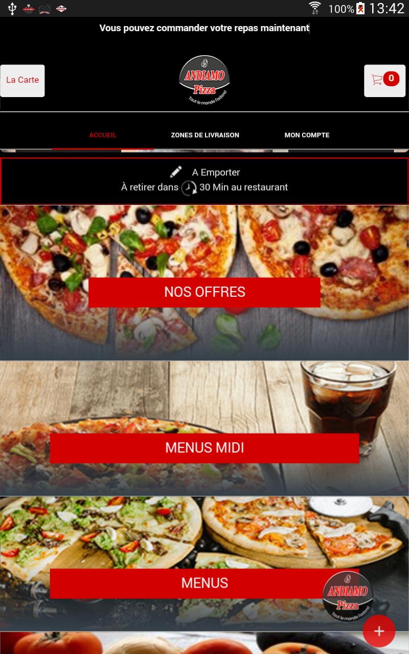 Aplikasi Android Andiamo Pizza Athis memungkinkan Anda memesan secara online atau melalui telepon melalui aplikasi Anda. Anda dapat berkonsultasi dengan kartu kami dan memilih produk Anda.