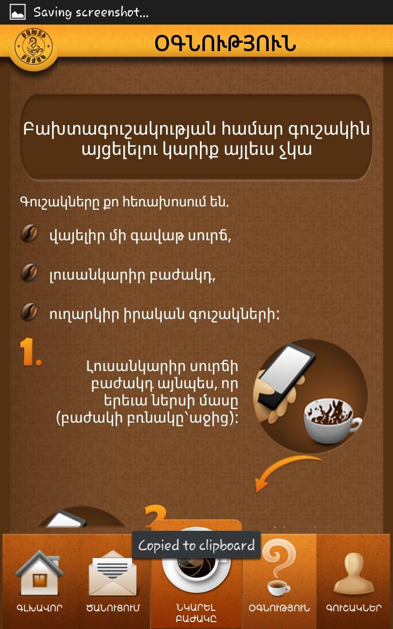 Aplikasi seluler yang unik ini, pemenang penghargaan khusus "Orange" di ARMNET Awards 2013 dalam tiga bahasa (Armenia, Rusia, Inggris). Layanan ini tersedia tidak hanya di Armenia tetapi di negara -negara CIS lainnya - Rusia, Kazakhstan, Kyrgyzstan, Tajikistan.