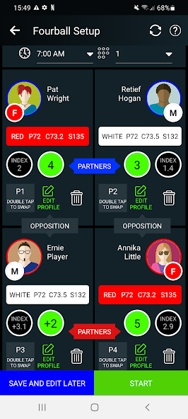 Easy One Screen 4-Ball Scoring dengan semua info yang Anda butuhkan di ujung jari Anda, termasuk tombol "pickup" yang menghitung skor maksimum Anda di lubang