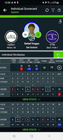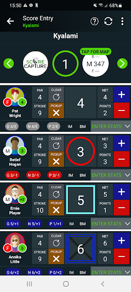 Kartu skor digital menunjukkan bruto, bersih, poin dan bruto Anda yang disesuaikan dalam format individu atau 4-bola