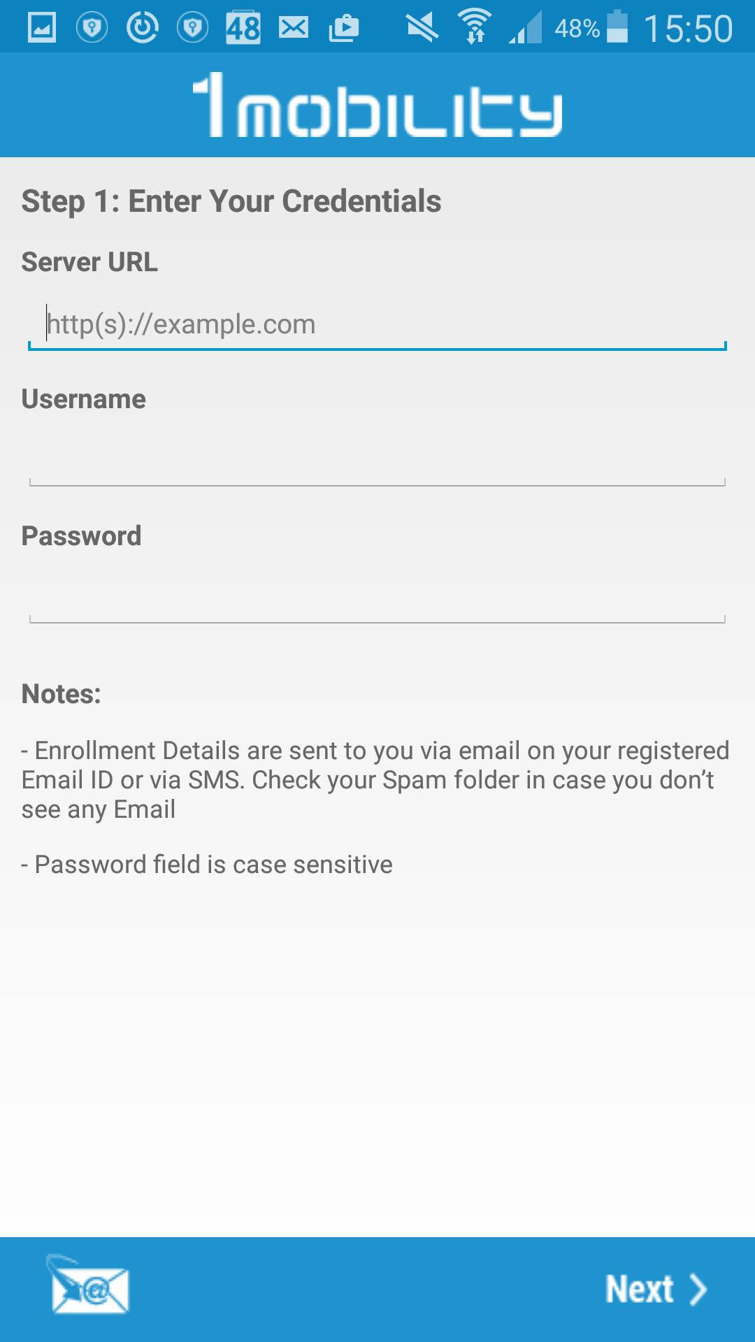 Penting: Aplikasi agen MDM 1Mobility adalah untuk perusahaan dan memerlukan pengaturan perangkat lunak back-end untuk berfungsi. Silakan hubungi administrator TI Anda untuk nama pengguna dan kata sandi.