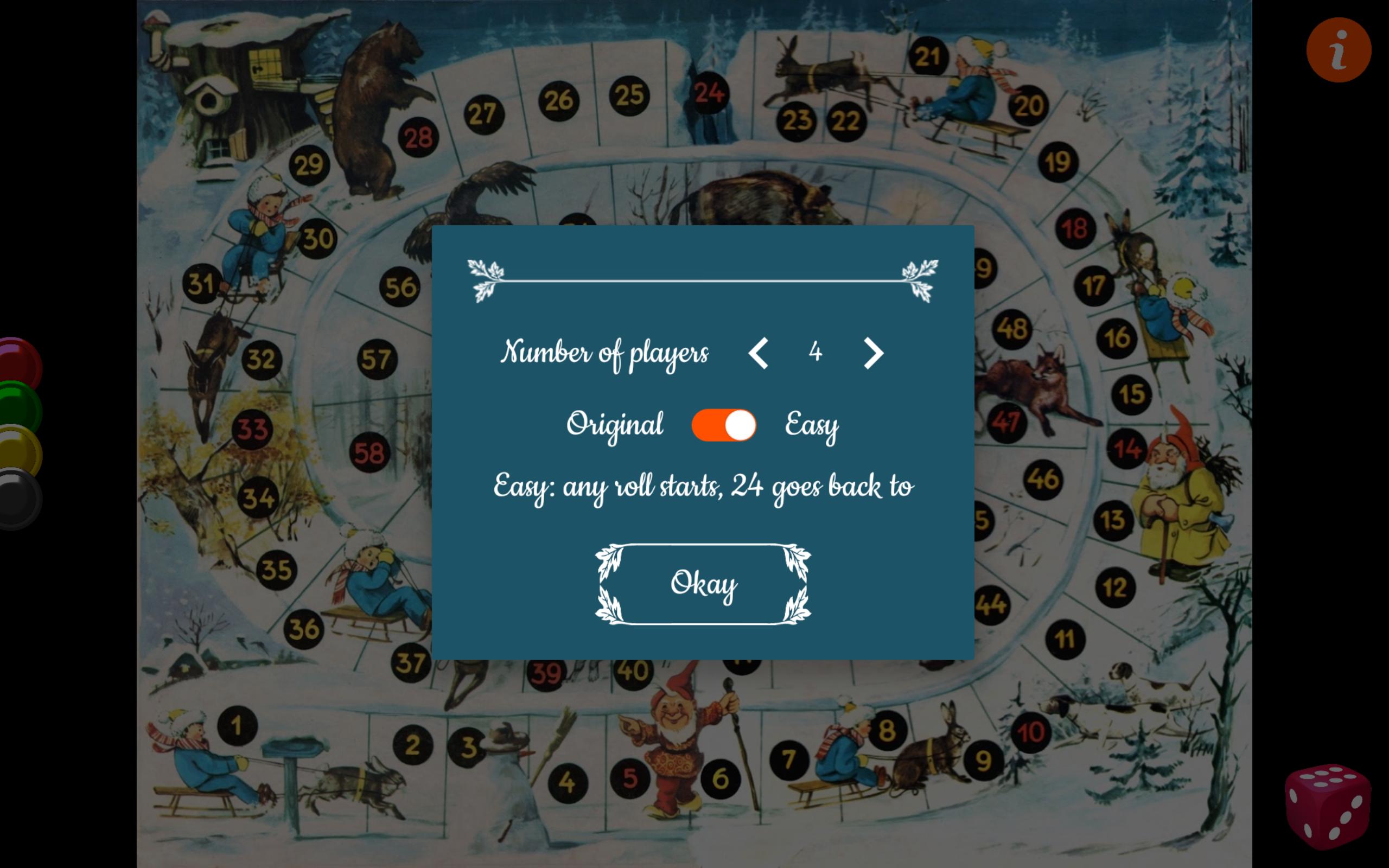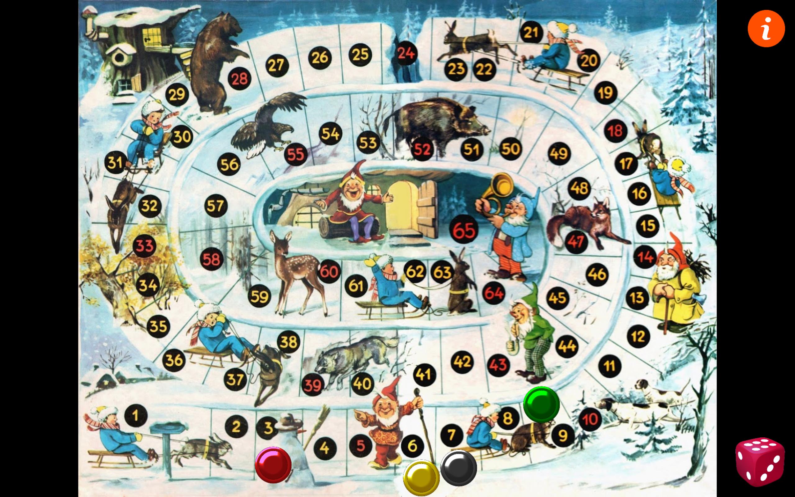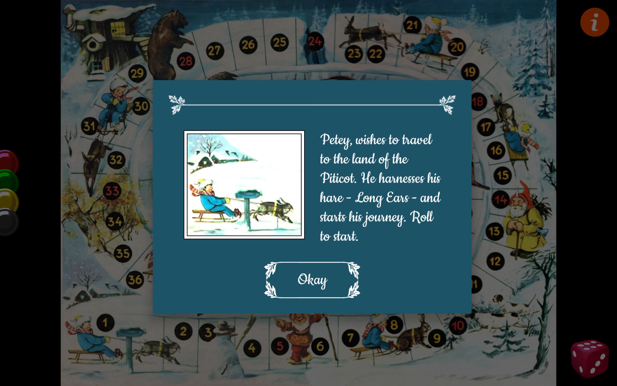 Permainan papan Roll & Move sederhana untuk pemain usia 4 - 10 di kursus musim dingin. Tujuannya adalah untuk mencapai gubuk Piticot di depan para pemain lain dengan menggulung skor dadu yang lebih tinggi dan menghindari perangkap pengaturan kembali.