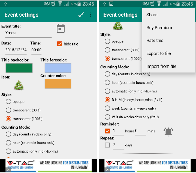指定された日付(またはそれ以降)までの週/日/時間/分数を示します。いくつかのカウントダウンウィジェットをホーム画面に追加でき、作成時に簡単にカスタマイズするか、後でそれらをタップすることで簡単にカスタマイズできます。ウィジェットデータをエクスポートおよびインポートすることもできます。