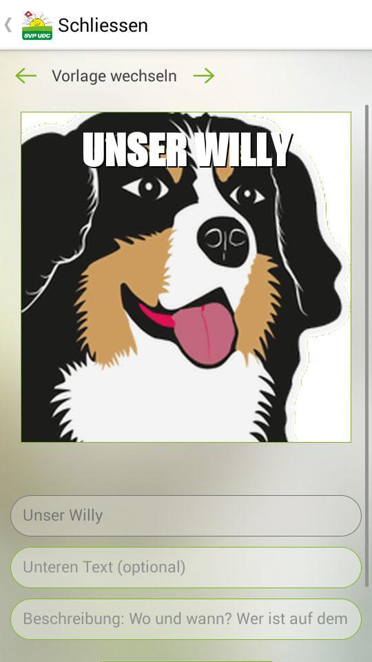 SVP-Foto-App SVP Switzerland Webサイトでさまざまなオンラインプラットフォームで簡単にアップロードでき、必要に応じて自分のFacebookプロファイルに切り替えられます。組み込みのミームジェネレーターを使用すると、写真に直接コメントと意見を書くことができます。さらに、最新のメッセージとアポイントメントは、アプリで直接呼び出すことができます。 2015年の選挙キャンペーンでSVPをサポートし、説明されている写真を送信するか、テンプレートを使用して既存の写真にコメントしてください。