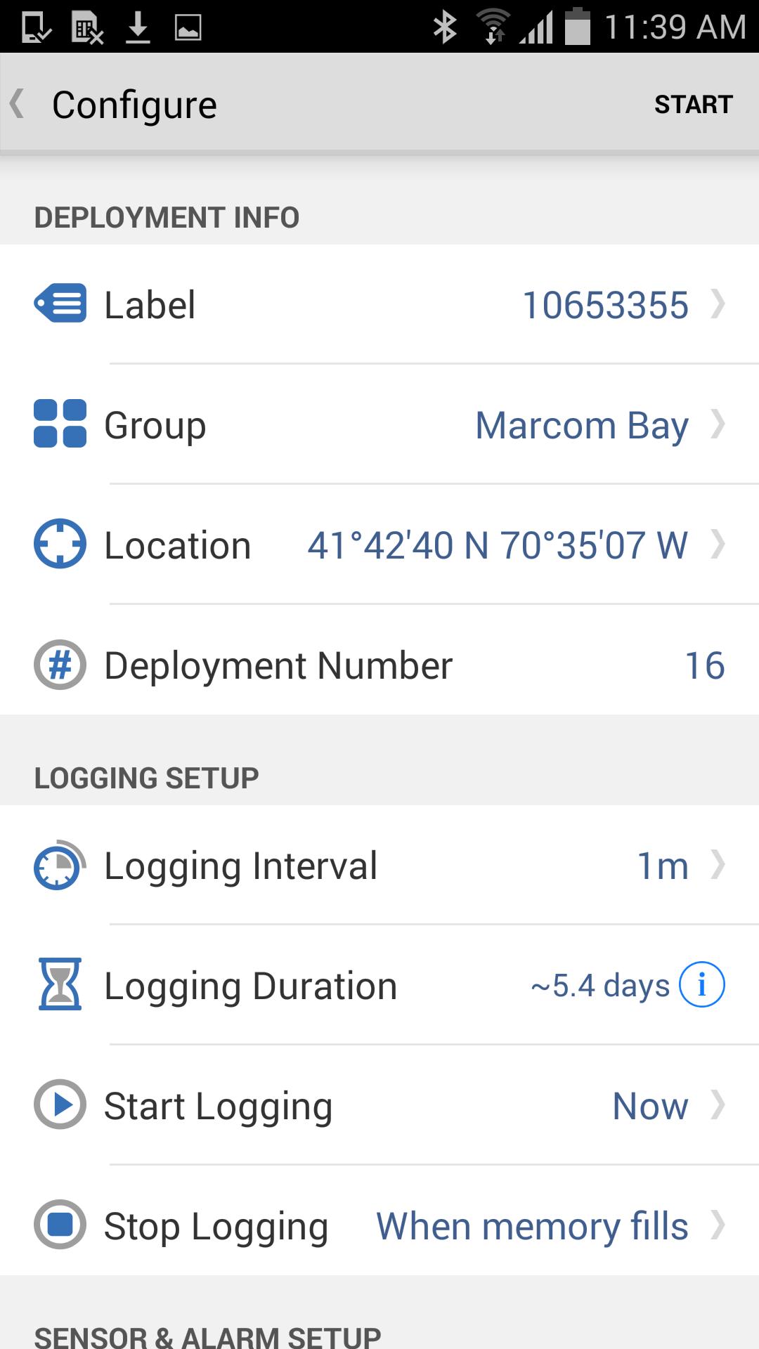 *データロガーの名前、パスワード、ロギングレート、アラームしきい値、開始時と停止時間の設定