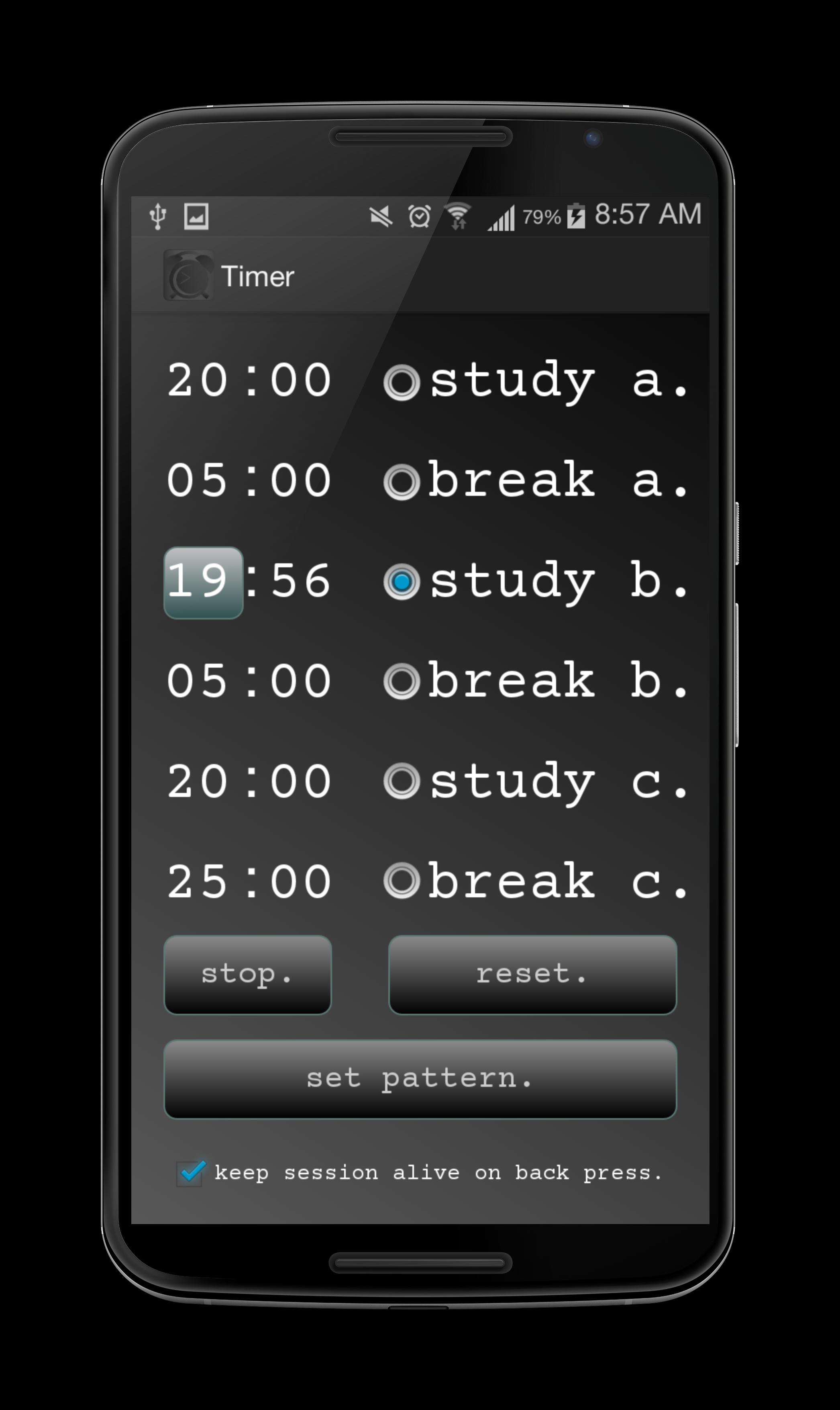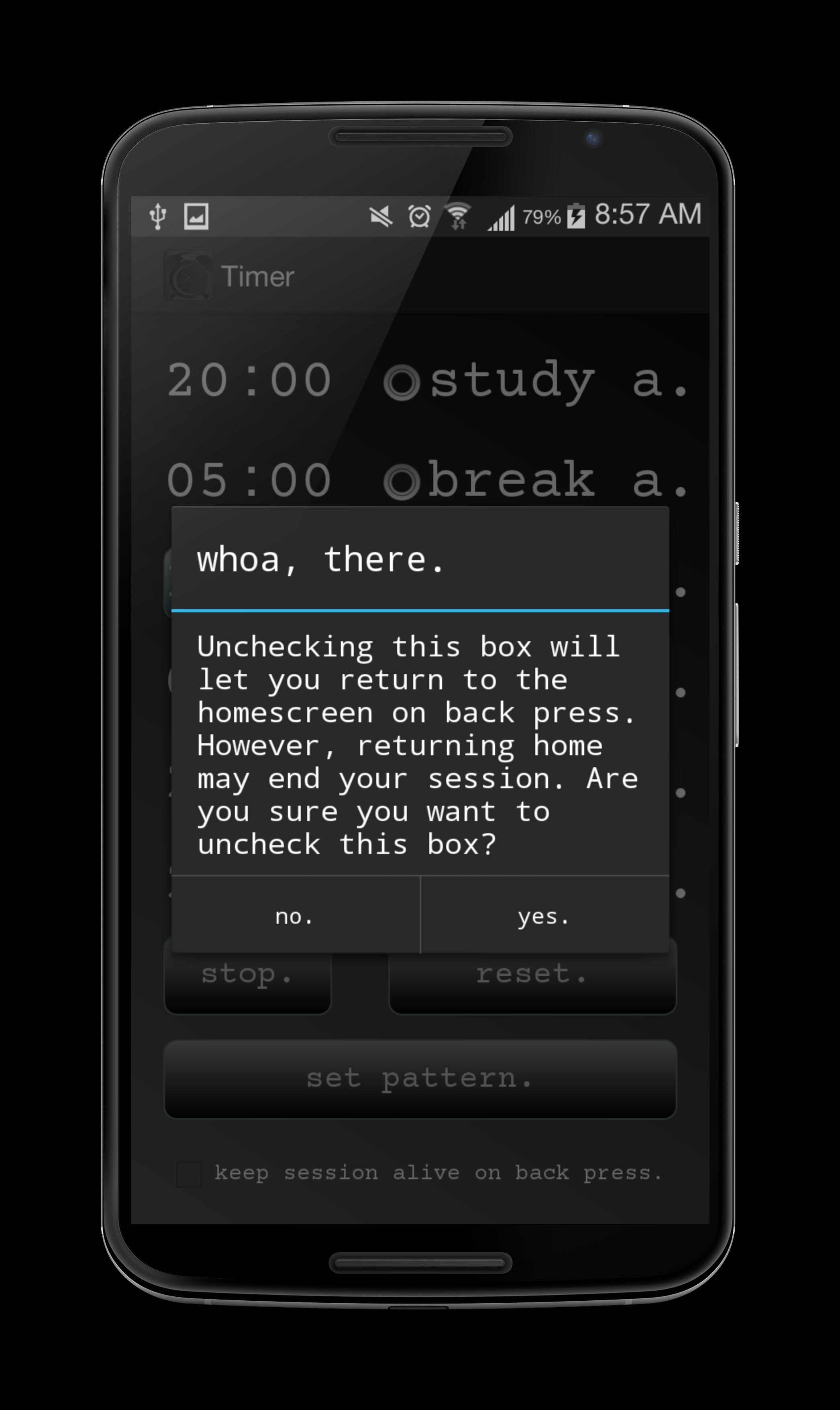 Ultimate Study Timerは、アルファ期間とベータ期間が終了したときに警告するための2つのユニークな振動パターンがあるため、画面を見る必要はありません。デバイスをポケットに入れておくだけです。休憩中にデバイスを使用している場合は、画面に小さなメッセージが表示され、どのような期間が終了したかを思い出させます。