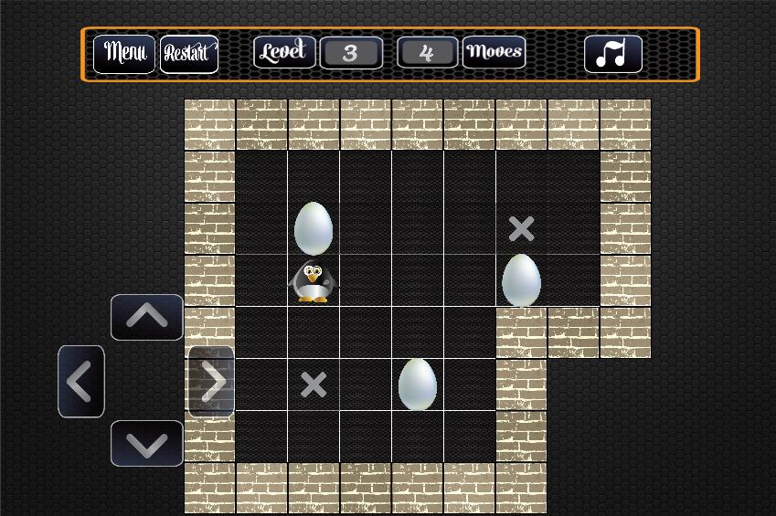 ペンギンはダンジョンに閉じ込められています。今、彼はここから抜け出すために難しいパズルを解決しなければなりません。あなたは彼が重い卵を動かし、それらを特別なプラットフォームに置くのを助けなければなりません。ステップが少ないほど、より多くのポイントを得ることができます。