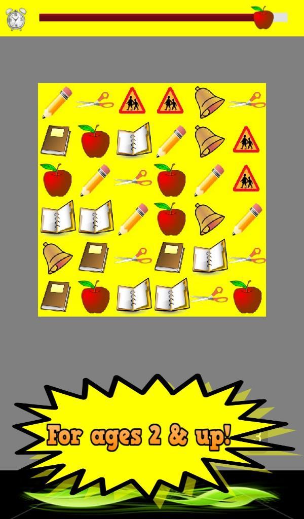 School Game for Kidsは、かわいい小さな学校のシンボルを備えたタイミングのマルチラウンドマッチングゲームです。子供向けのSchool Gameの最初のラウンドは100秒で、各ラウンドは20秒少ないため、各ラウンドはやや挑戦的です。子供向けのSchool Game 、幼児(あなたが彼らと遊ぶ場合)と未就学児に適している年齢は、大量のシンボルがないため、一致するのはやりがいがあり、楽しいです。