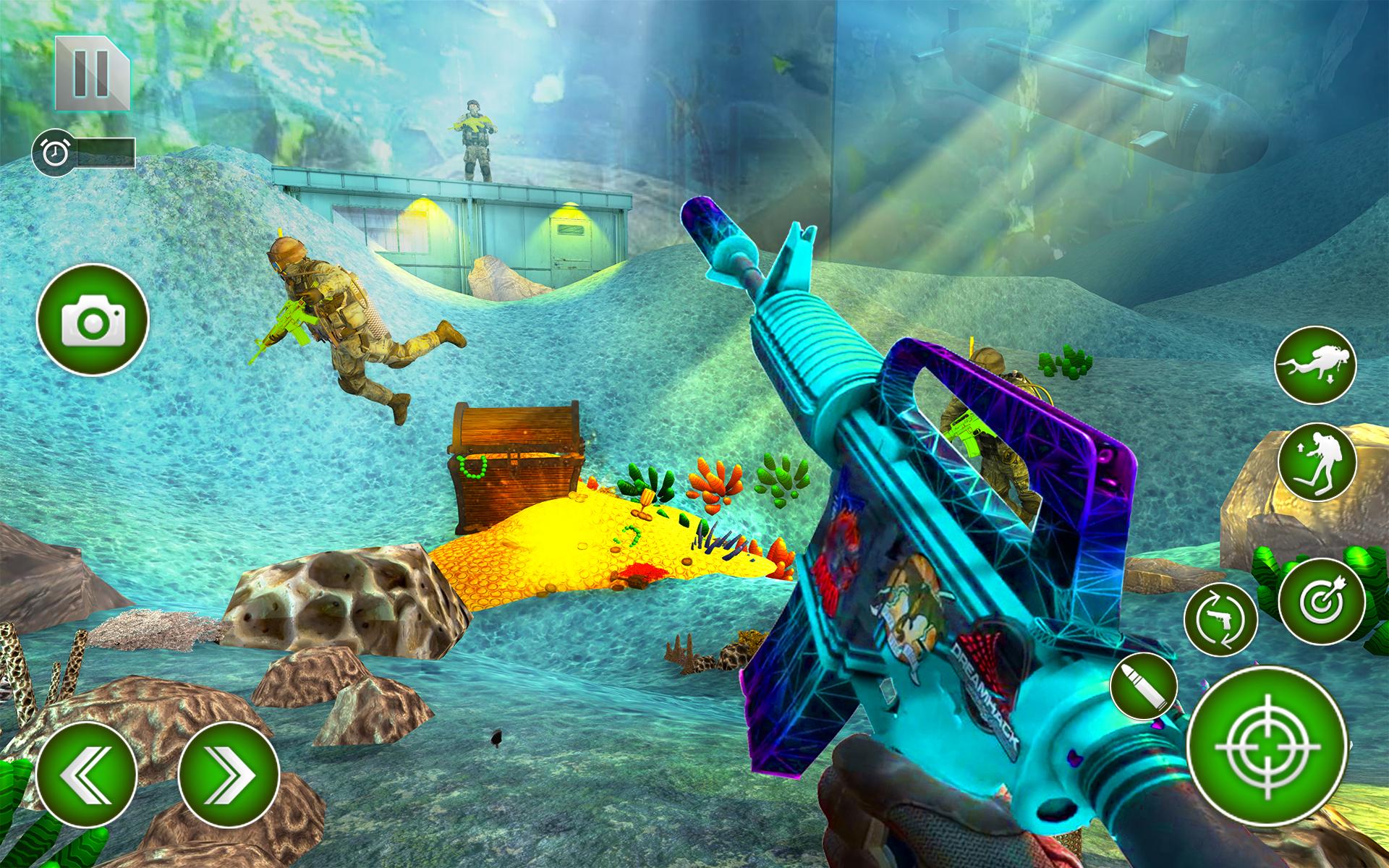 Underwater Treasure Hunt - Free FPS Shooting Game - 모든 캐주얼 촬영 게임 플레이어를위한 액션으로 가득 찬 수중 총기 촬영 미션 및 궁극적 인 FPS 촬영 게임. 당신의 사명은 간단합니다 - 바다 깊이에서 발견되는 보물을 지키고 침입자와 다른 테러리스트로부터 그것을 보호하십시오. 수중 깊은 곳에서 야생 동물이있을 것이며, 수중 촬영 게임 오프라인에서 보물이 당신이되기를 원한다면 살아 남기 위해 죽여야합니다.
